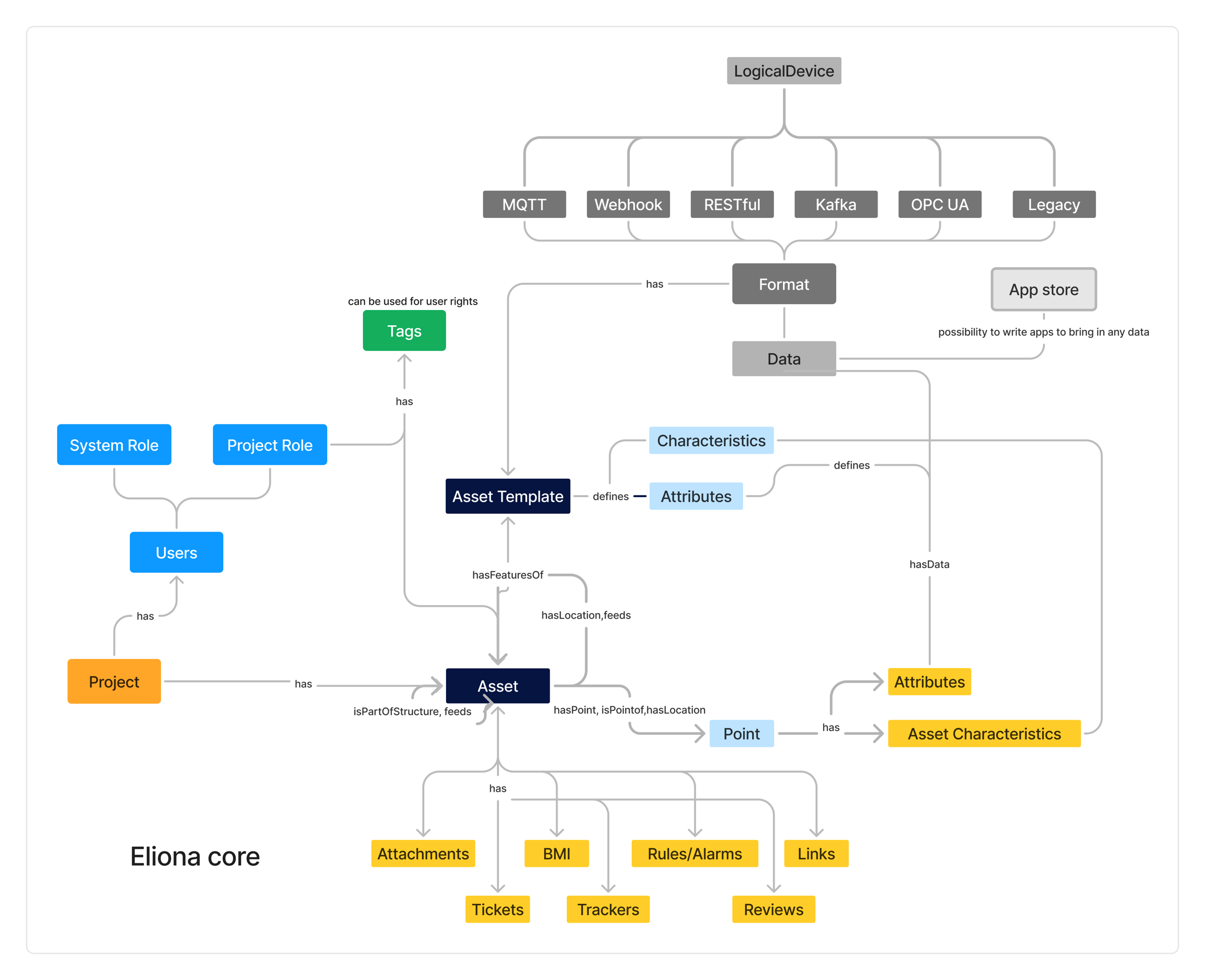 Eliona ist eine flexible und skalierbare Plattform, die verschiedene Bausteine von Ontologien wie Brick, Haystack und RealEstateCore nutzt. Hier ist eine allgemeine und übersichtliche Darstellung, wie Eliona aufgebaut ist: