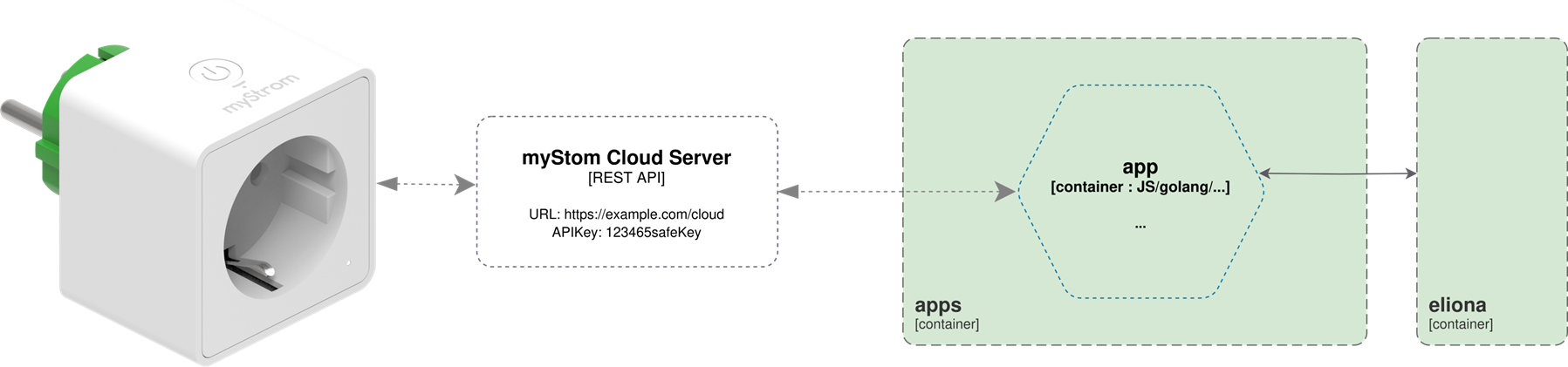 Die myStrom App ist ein typisches Beispiel für eine einfache, aber voll integrierte Eliona-App. Sie zeigt, wie ein externes Gerät – in diesem Fall eine smarte Steckdose – mit Eliona verbunden werden kann.