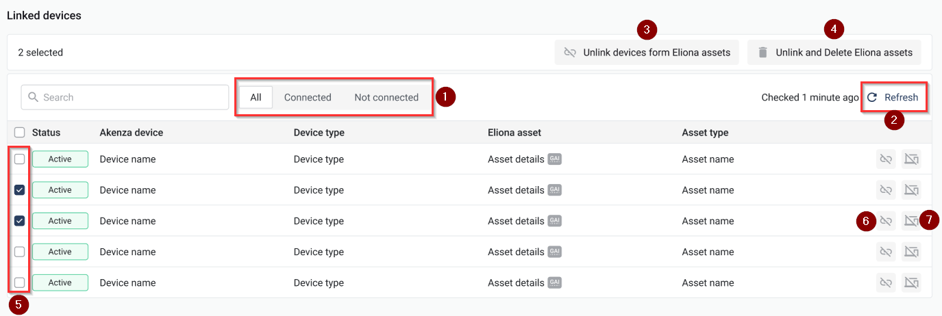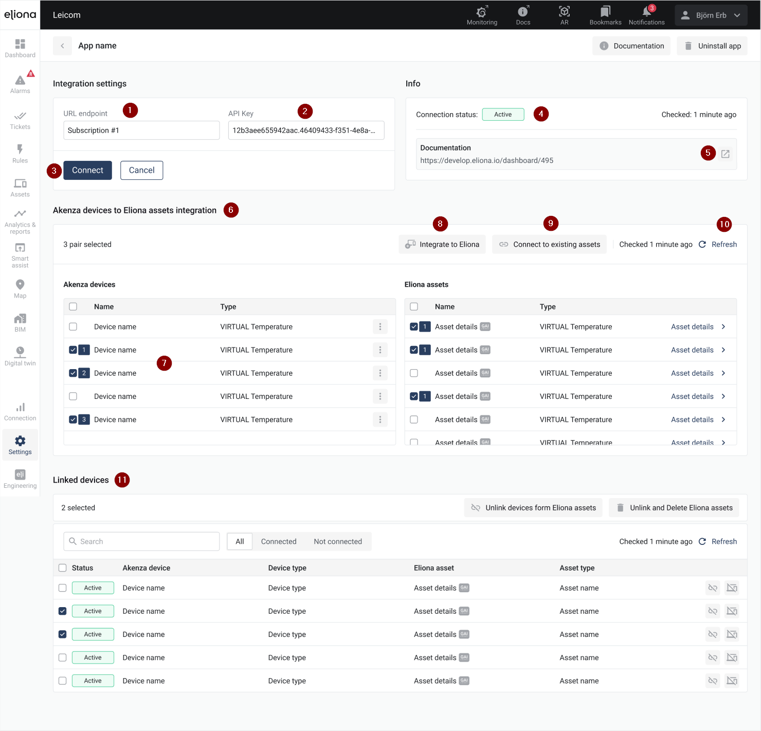 9. **Link:** Verknüpfen Sie Geräte mit Eliona Assets. Es werden die Geräte und Assets mit der gleichen Nummer (z.B. <img src="https://content.gitbook.com/content/Nyvwhz1kEMXcHf4HLuZ8/blobs/vH4lyrQ79l1TOQ7XzsiL/DBED3F28-A2EA-49FE-AED8-3D4EA651A469.png" alt="" data-size="line">) miteinander verknüpft.