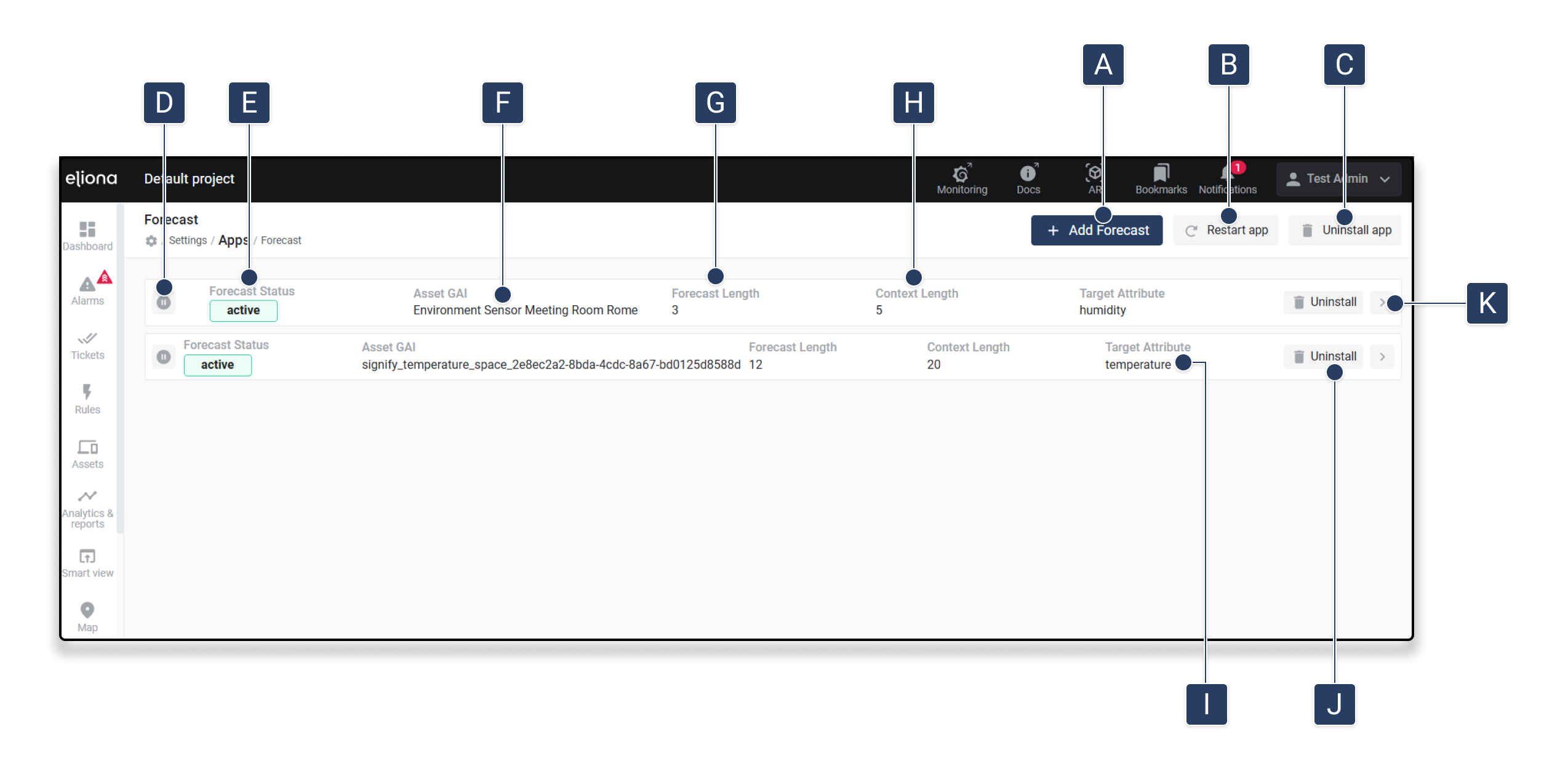 <table data-full-width="true"><thead><tr><th width="98.60000610351562">Symbol</th><th width="247">Bezeichnung</th><th>Beschreibung</th></tr></thead><tbody><tr><td><strong>[A]</strong></td><td>Prognose hinzufügen</td><td>Öffnet ein Formular zur Erstellung einer neuen Prognose-Konfiguration.</td></tr><tr><td><strong>[B]</strong></td><td>App neu starten</td><td>Startet die <em>Forecast app</em> neu, z. B. nach Änderungen an einer Konfiguration.</td></tr><tr><td><strong>[C]</strong></td><td>App deinstallieren</td><td>Entfernt die <em>Forecast app</em> vollständig aus dem Projekt.</td></tr><tr><td><strong>[D]</strong></td><td>Prognose starten/pausieren</td><td>Startet oder stoppt die Vorhersage.</td></tr><tr><td><strong>[E]</strong></td><td>Prognose-Status</td><td>Zeigt an, ob die Vorhersage momentan Aktiv oder Inaktiv ist.</td></tr><tr><td><strong>[F]</strong></td><td>Asset-GAI</td><td>Der <em>Global Asset Identifier</em> des zugeordneten Assets.</td></tr><tr><td><strong>[G]</strong></td><td>Prognose-Länge</td><td>Gibt an, wie viele Schritte in die Zukunft prognostiziert werden.</td></tr><tr><td><strong>[H]</strong></td><td>Kontext-Länge</td><td>Anzahl der historischen Werte, die zur Prognose-Berechnung verwendet werden.</td></tr><tr><td><strong>[I]</strong></td><td>Zielattribut</td><td>Das Attribut des Assets, das prognostiziert wird (z. B. <em>temperature</em>).</td></tr><tr><td><strong>[J]</strong></td><td>Konfiguration entfernen</td><td>Löscht die einzelne Forecast-Konfiguration.</td></tr><tr><td><strong>[K]</strong></td><td>Weitere Optionen</td><td>Öffnet ein Kontextmenü mit zusätzlichen Bearbeitungsmöglichkeiten. <a href="forecast-and-training-starten">→ Forecast Details</a></td></tr></tbody></table>
