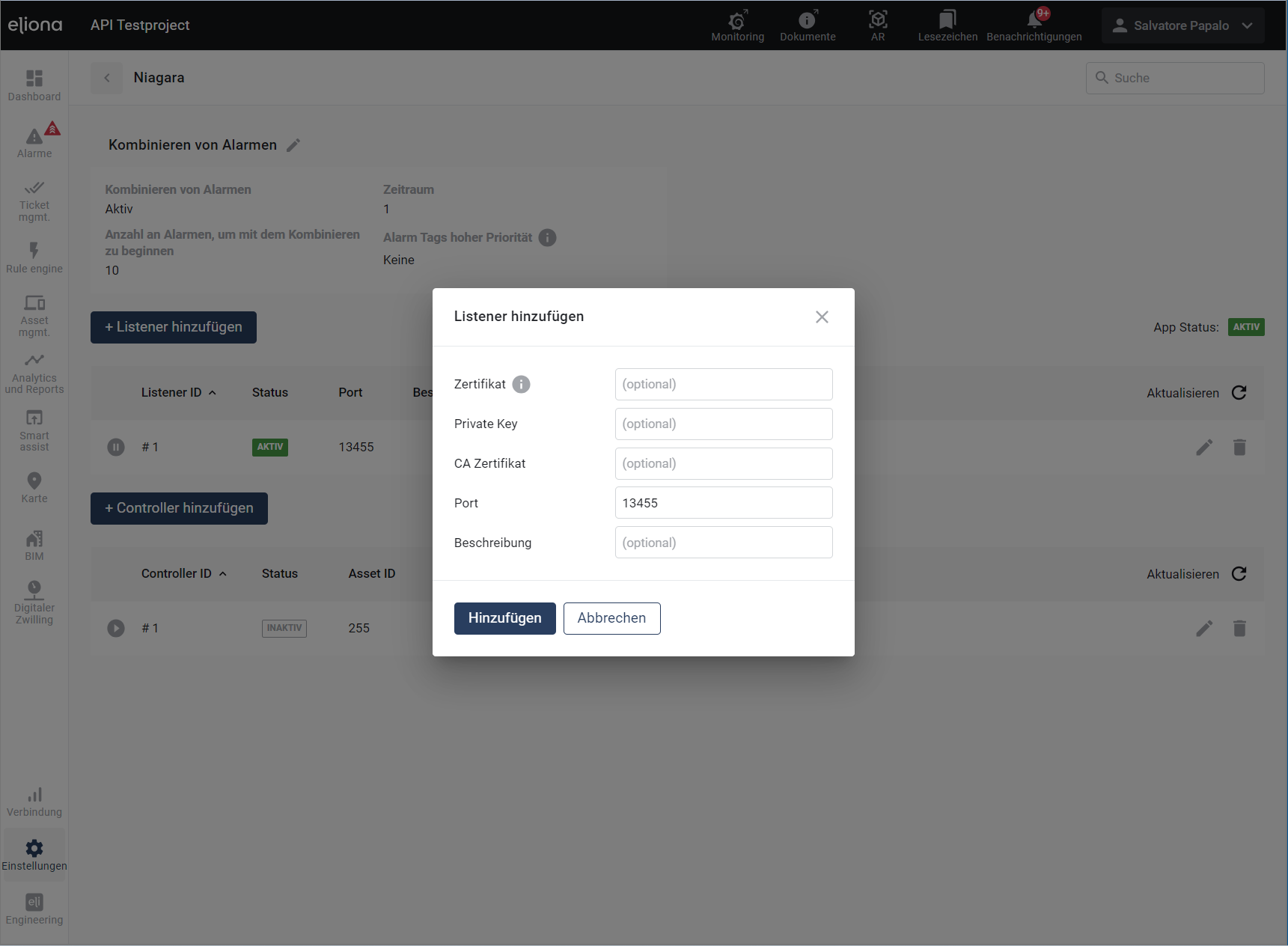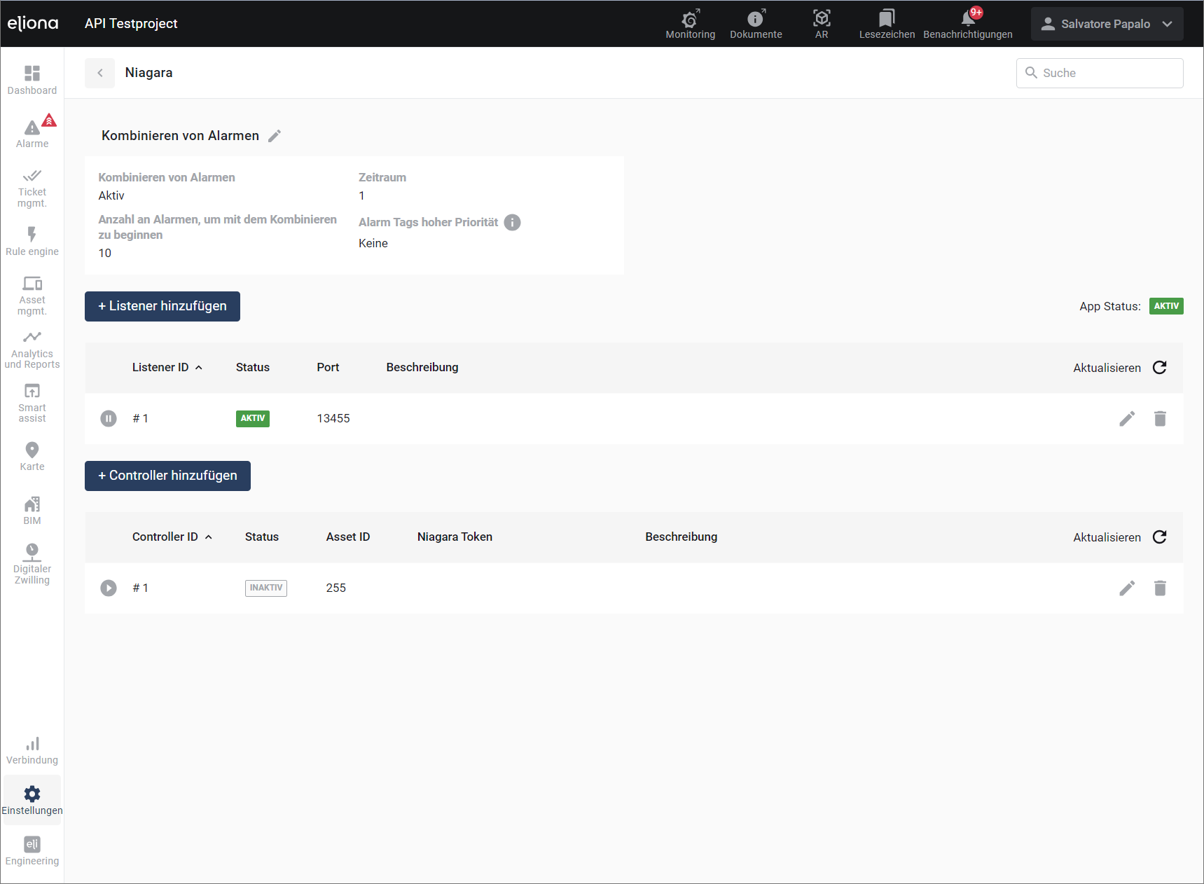 Niagara stellt Hardware wie "Controller" und "Listener" zur Verfügung. Die Geräte können mit Eliona verbunden werden. In [Einstellungen](https://docs.buildings.ability.abb/collection/german-14.2-freezed/apps/apps/broken-reference)>[Apps](https://docs.buildings.ability.abb/collection/german-14.2-freezed/apps/apps/broken-reference)>Niagara können Sie die "Controller" und "Listener" Ihres Niagara Systems einbinden:&#x20;