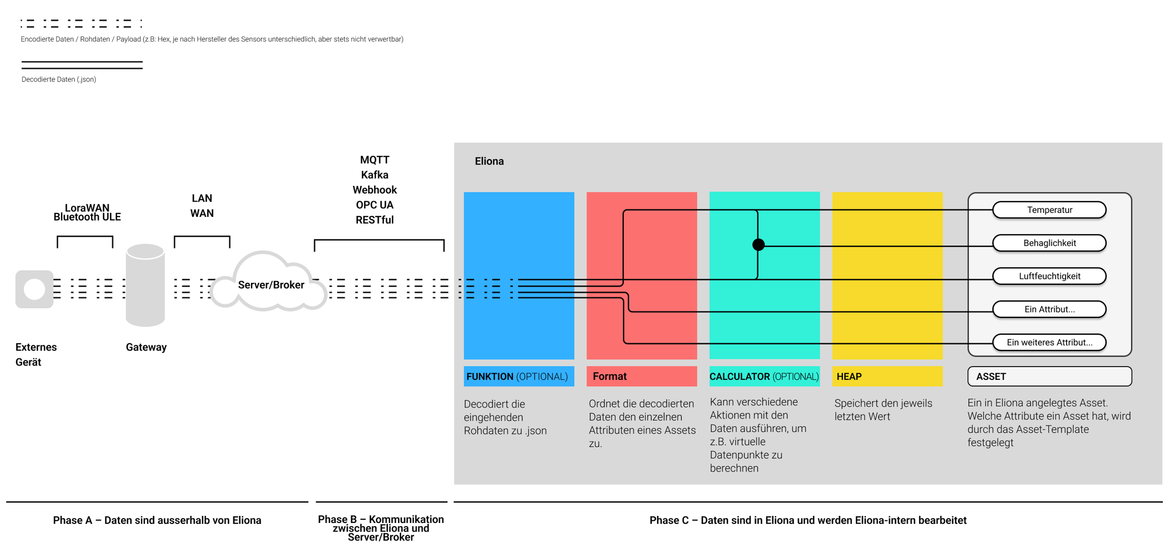 • Die von den externen Geräten gesendeten und in Eliona eingehenden Daten sind in den meisten Fällen nicht ohne weiteres lesbar. Je nach Hersteller sind diese Rohdaten encodiert oder liegen in einem nicht weiter verwendbaren Format vor. Deshalb werden diese Rohdaten mit Funktionen decodiert und in ein menschenlesbares .json Format umgewandelt.