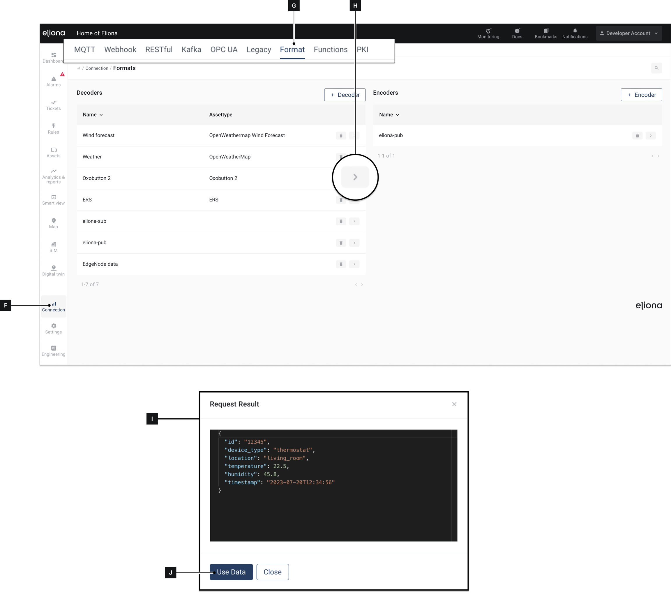 Bei dem Format das Sie bearbeiten möchten: Klicken Sie auf [H] ▷ Es öffnet sich die Payload-Vorschau [I]. Die Payload-Vorschau enthält einen Beispiel-Payload. Der Inhalt der Payload-Vorschau wird im nächsten Schritt im Feld [B3] angezeigt.