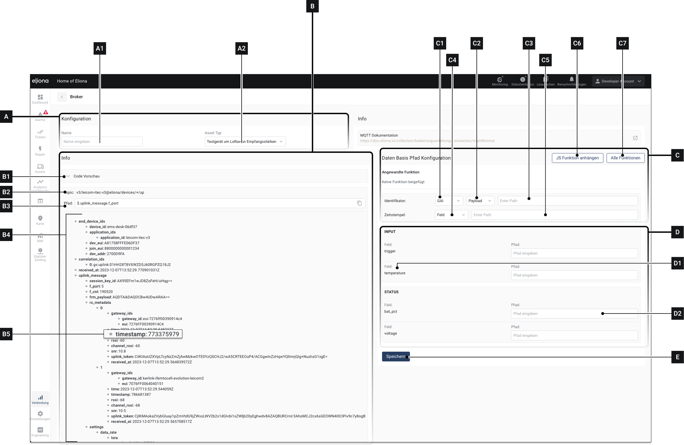 Wählen Sie aus, wie der Zeitstempel erkannt werden soll. Zur Auswahl stehen: - Auto: Der Zeitstempel wird automatisch erkannt - Feld: Ziehen Sie einen Payload-Eintrag in das Feld [C5]
