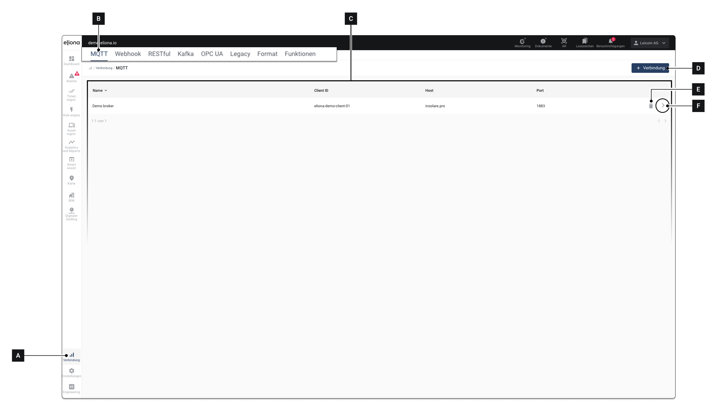 Im Arbeitsbereich wird eine Liste aller bereits verbundenen Broker angezeigt [C] ◈ Wenn Sie keine Einträge sehen, wurden noch keine Broker verbunden ◈ Es werden auch Broker angezeigt, die in anderen Projekten konfiguriert wurden