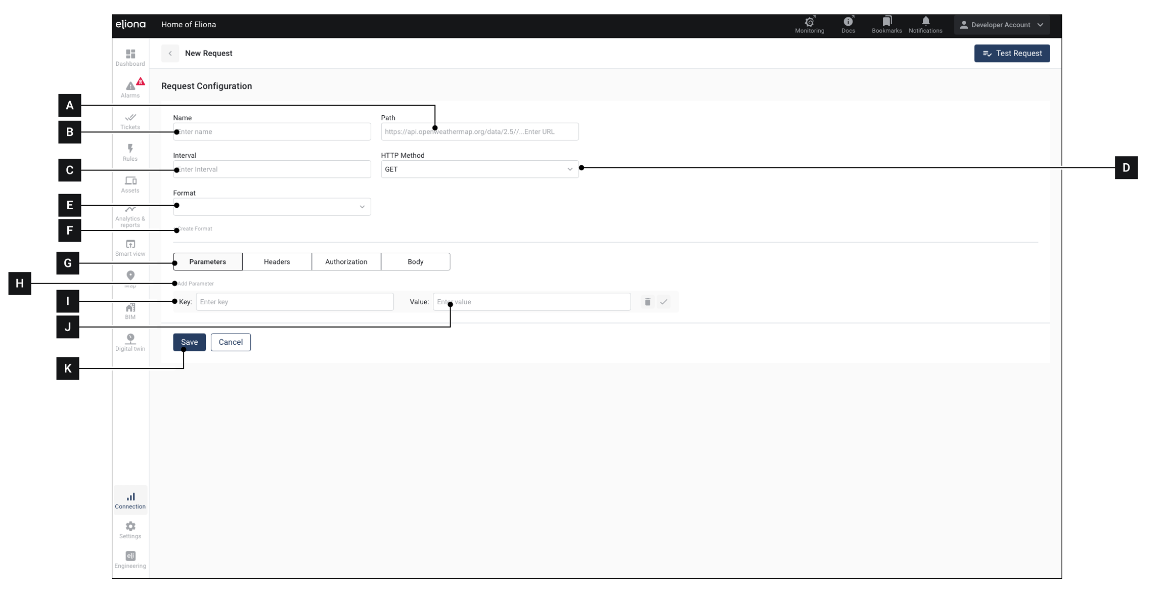 In diesem Fenster können Sie einen GET Request Schritt für Schritt konfigurieren. Wie genau ein Request aussehen muss, erfahren Sie in der Dokumentation der jeweiligen API.