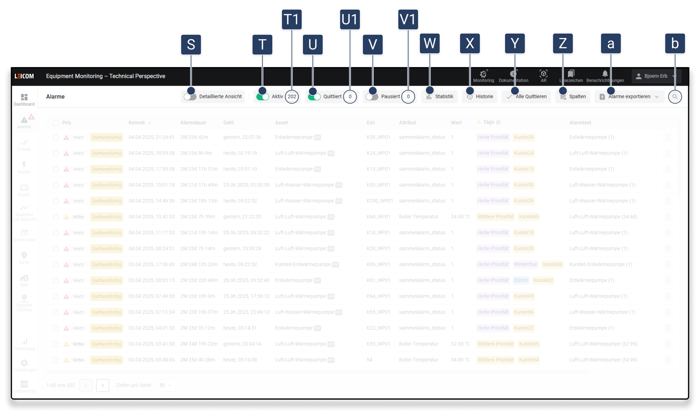 Exportiert die aktuelle Alarmübersicht als Datei. Zur Auswahl stehen: – CSV-Format – XLSX-Format (Excel-kompatibel) Die Exportdatei enthält alle sichtbaren Spalten in der aktuellen Ansicht.