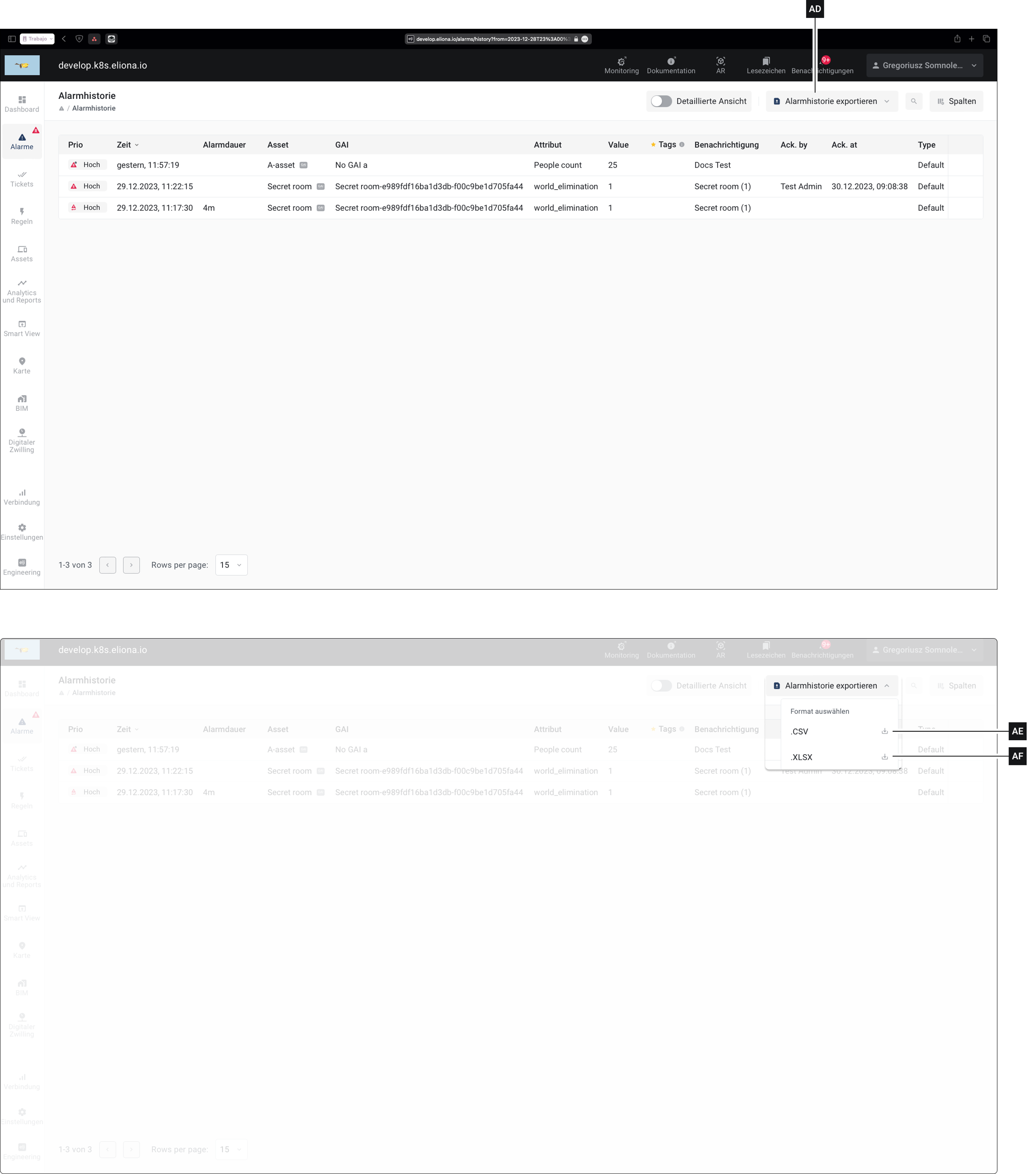 Klicken Sie auf AE oder AF um die Alarm-Historie als .csv bzw. als .xlsx Datei herunterzuladen.