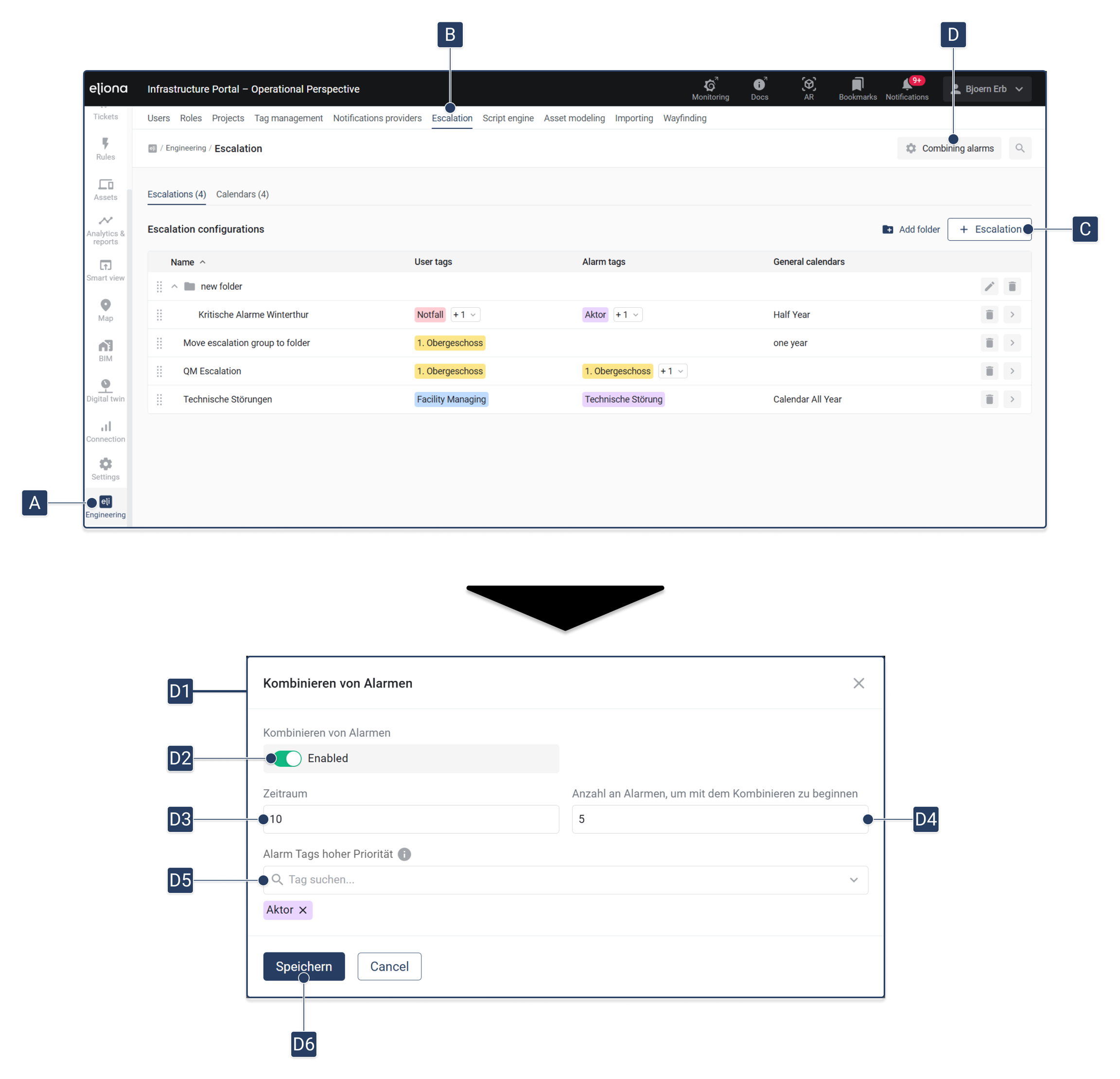 Wenn innerhalb kurzer Zeit viele Alarme ausgelöst werden, kann dies zu einer Flut von Benachrichtigungen führen. Um dies zu vermeiden, können Alarme innerhalb einer Eskalation kombiniert werden. Dabei werden mehrere eingehende Alarme zu einer einzigen Eskalationsnachricht zusammengefasst – abhängig von individuell festgelegten Bedingungen. Zusätzlich können bestimmte Alarm-Tags von der Kombination ausgeschlossen werden, sodass diese weiterhin einzeln eskaliert werden.