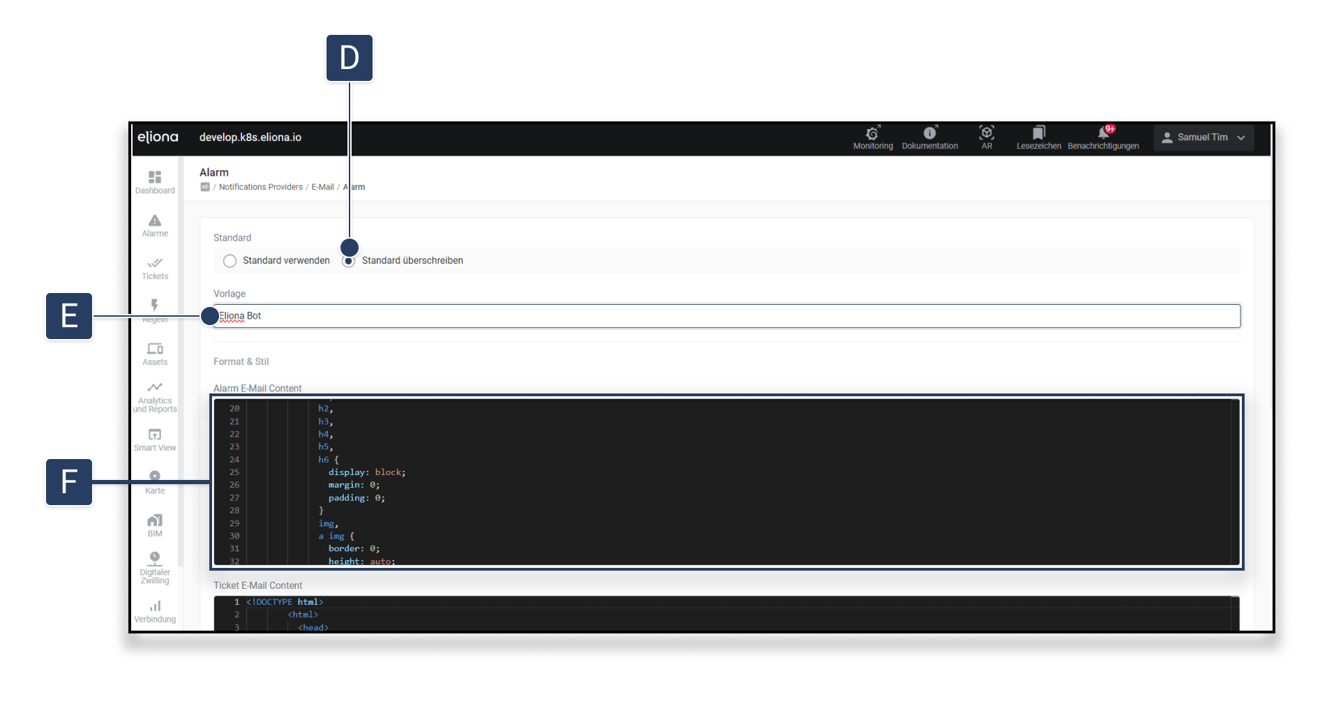 Eliona ermöglicht es Ihnen, individuelle E-Mail-Templates für verschiedene Benachrichtigungen anzupassen. Dies betrifft nicht nur Alarm-E-Mails, sondern auch Ticket E-Mail Content und Password Reset E-Mail Content. Durch die Anpassung dieser Templates können Sie das Design, den Stil und den Inhalt Ihrer E-Mails optimal auf Ihre Bedürfnisse abstimmen.