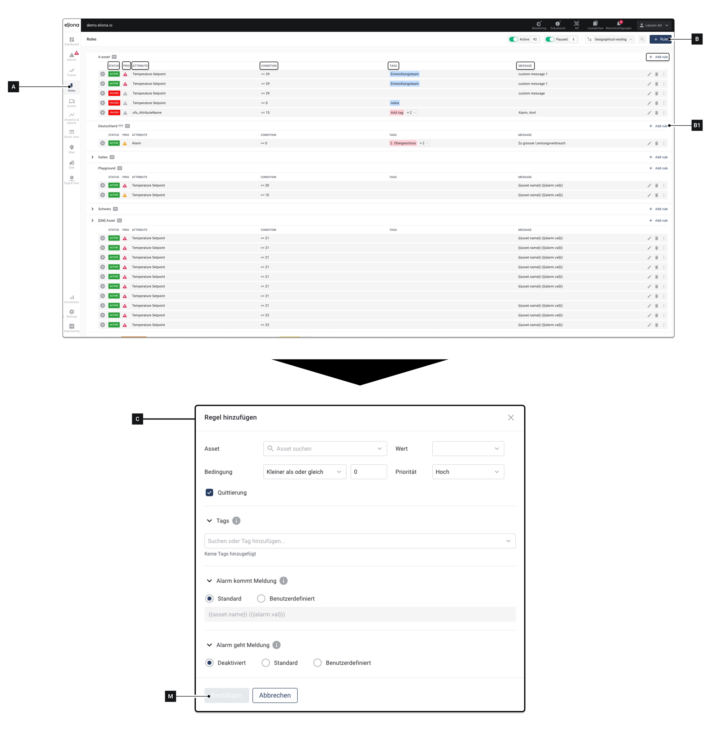 Klicken Sie auf [B] ▷ Das Fenster Regeln hinzufügen [C] öffnet sich ◈ Alternativ können Sie auch auf eins der Felder [B1] klicken. In diesem Fall wird die Regel direkt im entsprechenden Asset erstellt. Das Feld [D] muss dann nicht mehr ausgefüllt werden