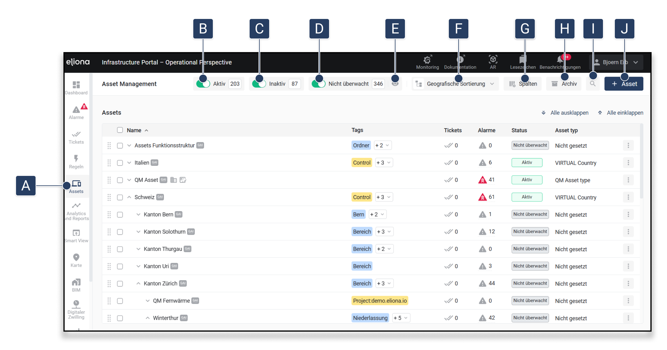 Über diesen Menüpunkt können Sie auswählen, ob Sie Assets geografisch oder funktional sortieren möchten. ↗ Erfahren Sie mehr zur Sortierung von Assets