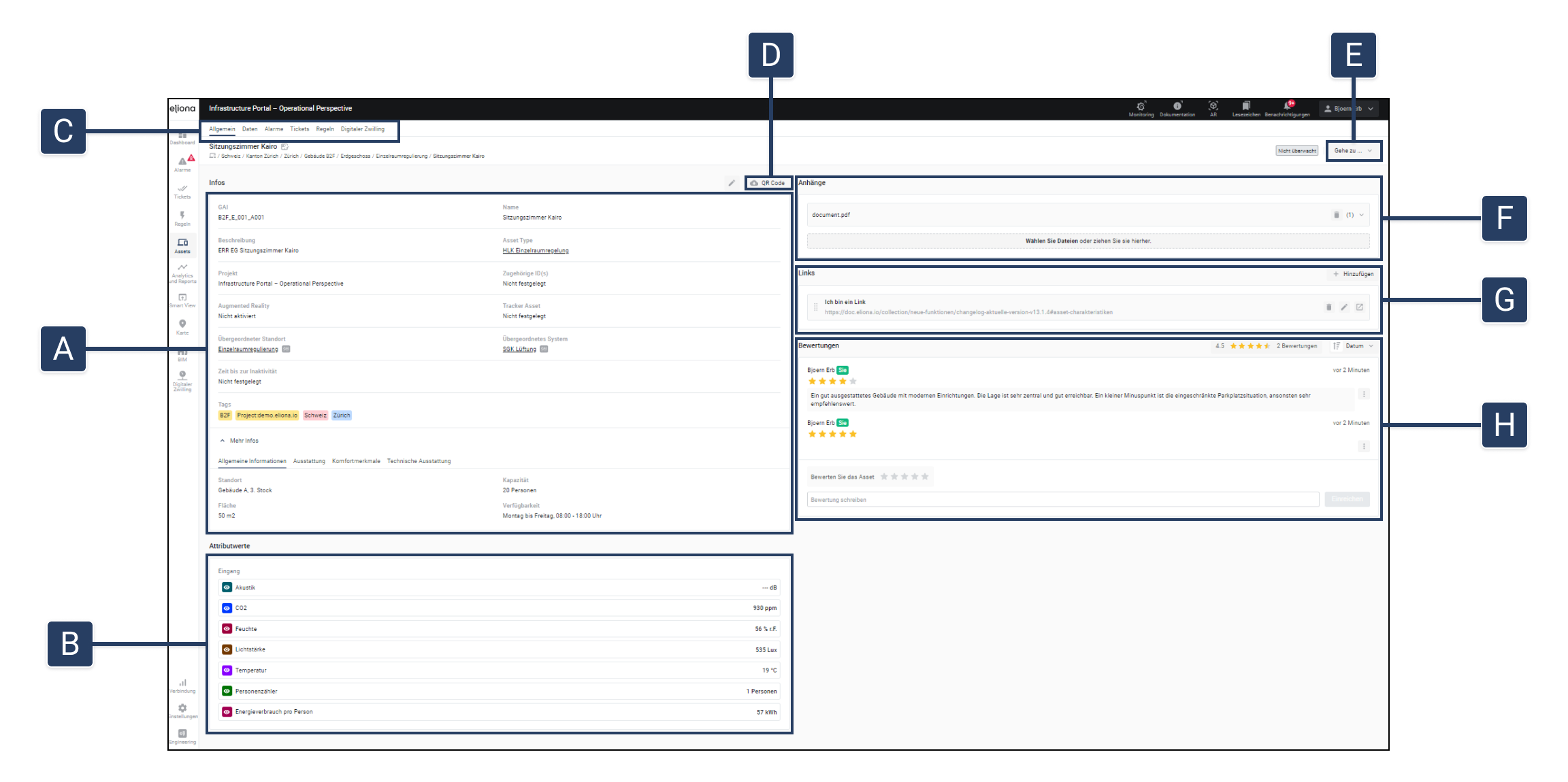 Schnellzugriff auf zum jeweiligen Asset gehörigen Informationen und Einstellungen