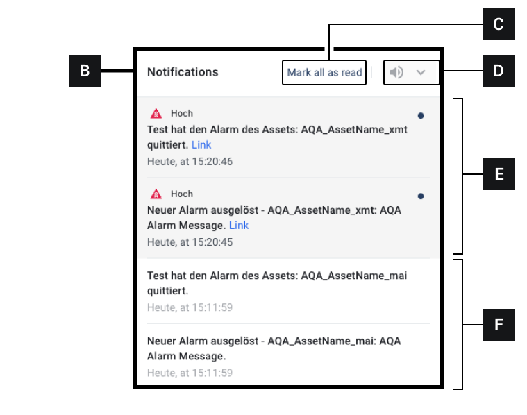 Neue Benachrichtigungen sind mit einem Punkt markiert und dunkel hinterlegt. Klicken Sie auf eine Benachrichtigung, um sie als gelesen zu markieren