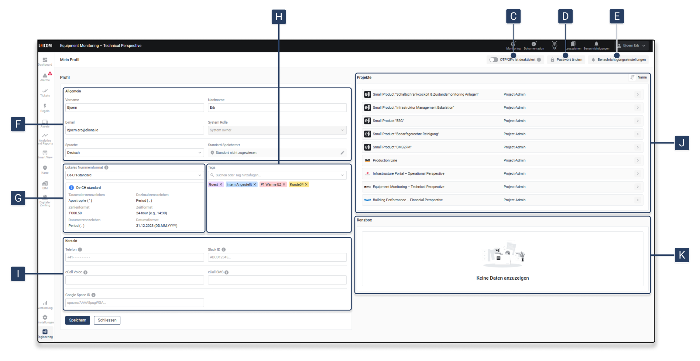 Klicken Sie auf das Zahnradsymbol [B] neben Ihrer E-Mail-Adresse ▷ Die Seite Mein Profil öffnet sich mit allen persönlichen Einstellungen