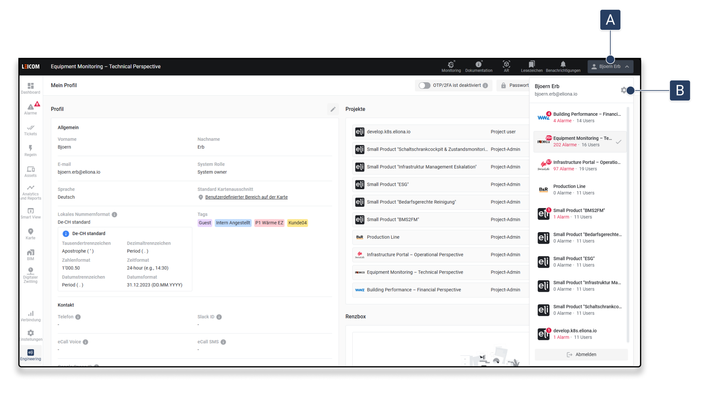 Klicken Sie oben rechts auf Ihren Namen [A] in der Kopfleiste ▷ Das Benutzermenü öffnet sich