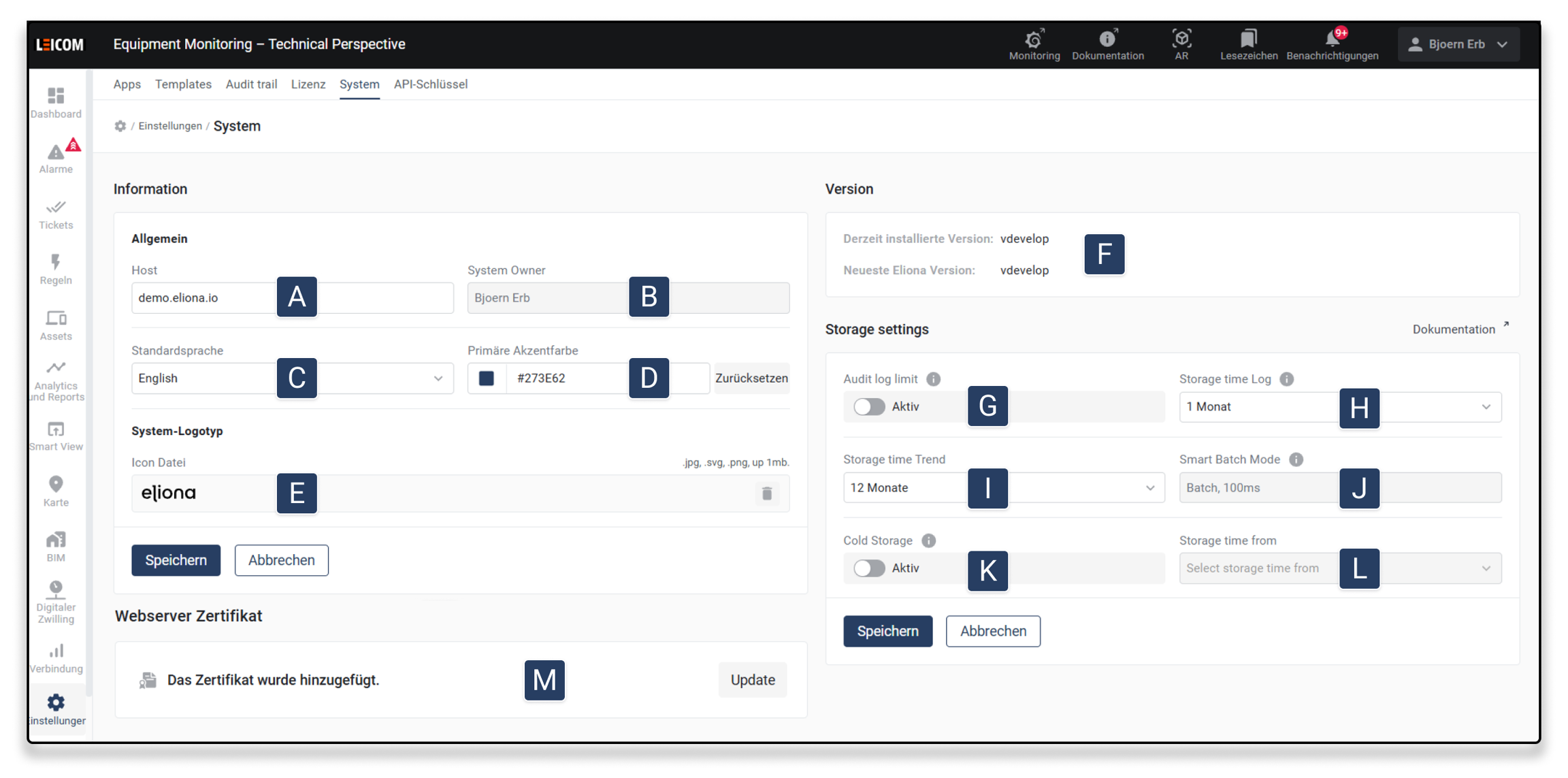 Zeigt den aktuellen Status des hinterlegten Zertifikats an. Über die Schaltfläche Update können neue Zertifikatsdateien (.crt / .key) hochgeladen werden. Nach dem Austausch wird die Eliona-Instanz automatisch neu gestartet und ist wieder über eine sichere HTTPS-Verbindung erreichbar.