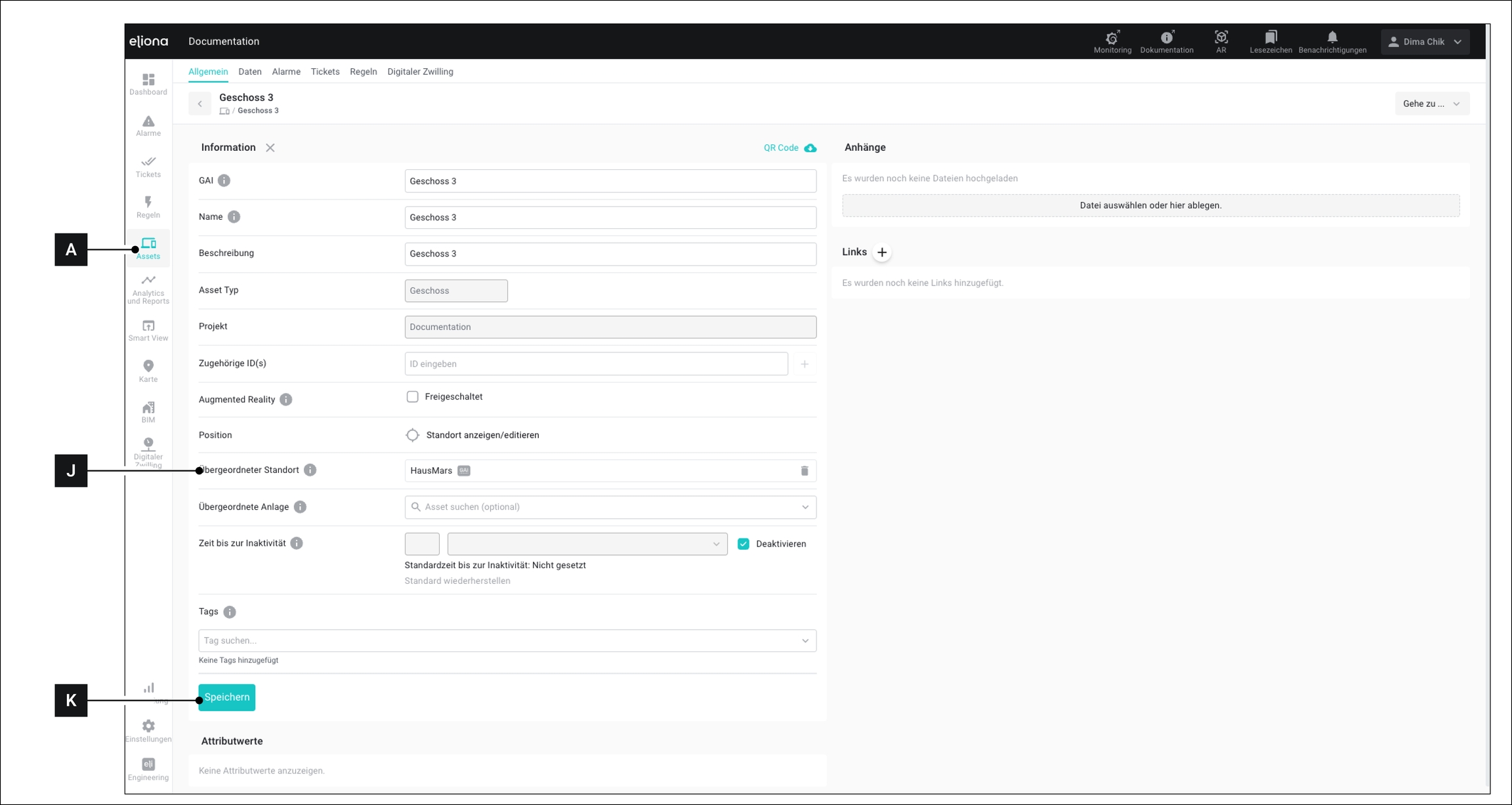 Im Punkt Übergeordneter Standort [J] – Wählen Sie ein Asset, dem Sie das Stockwerk zuordnen wollen. ◈ Meistens ist das übergeordnete Asset ein Gebäude.