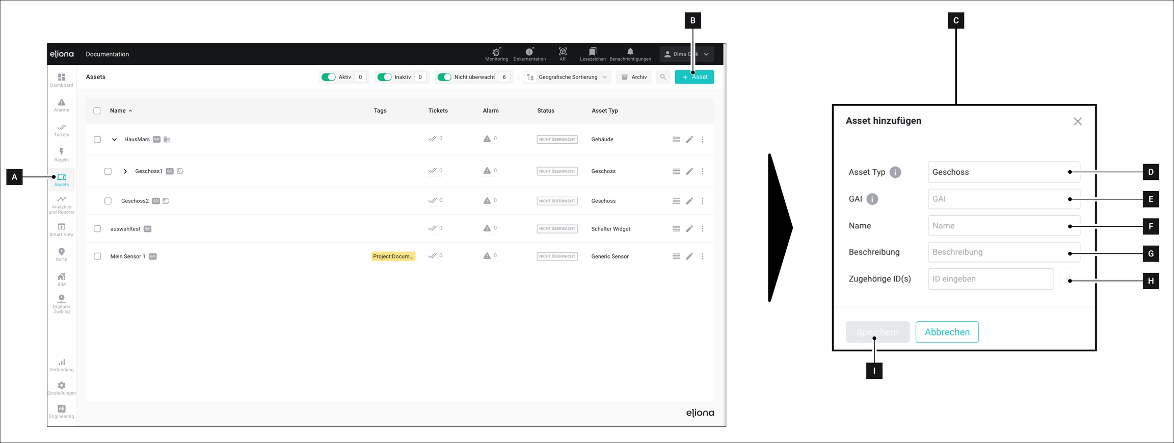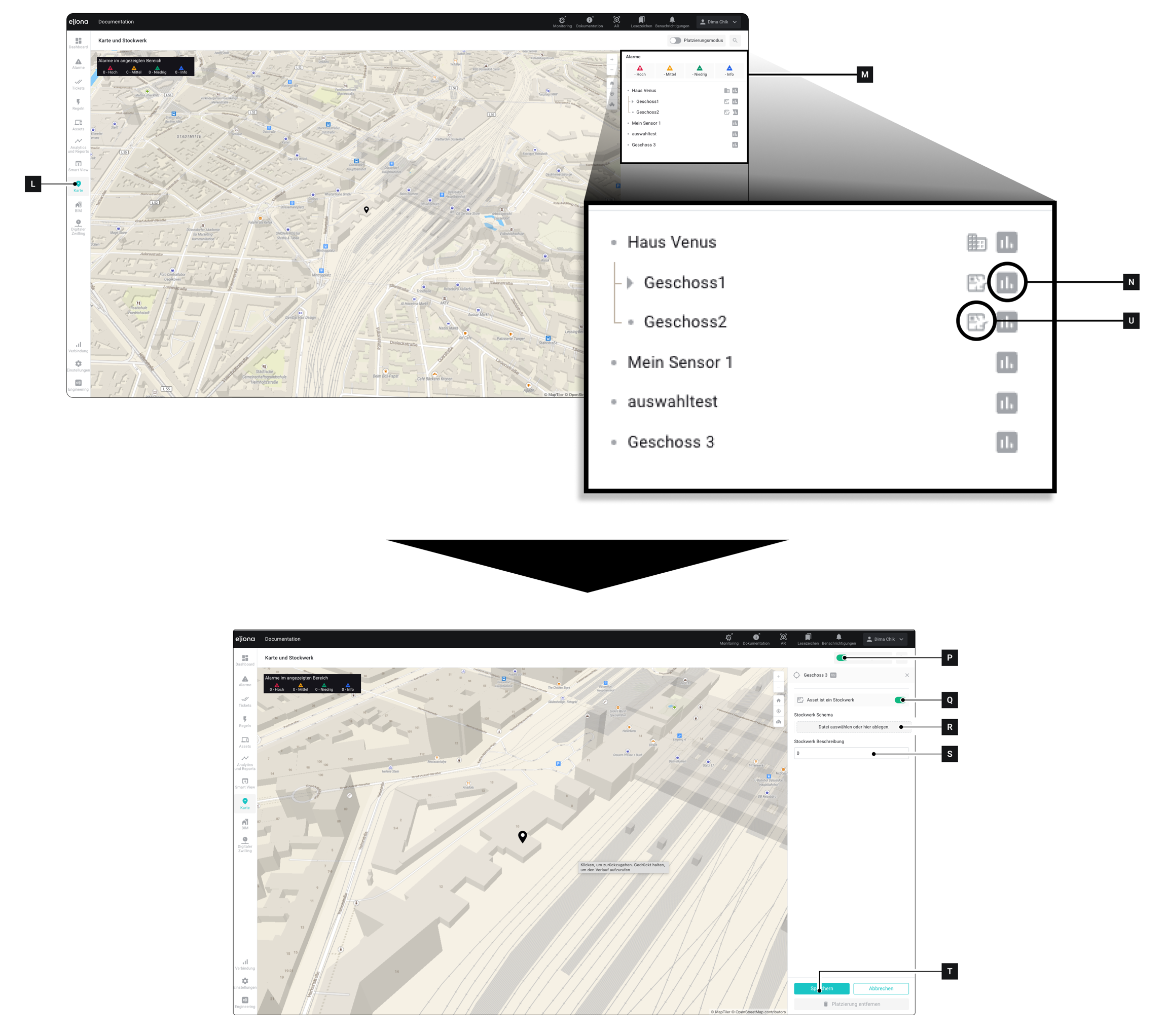 Klicken Sie auf Speichern [T] ▷ Das Geschoss wurde erstellt. ▷ Das Geschoss wird mit einem Icon [U] markiert. ▷ Im Menü Assets [A] erscheint das Stockwerk nun unter dem übergeordneten Asset