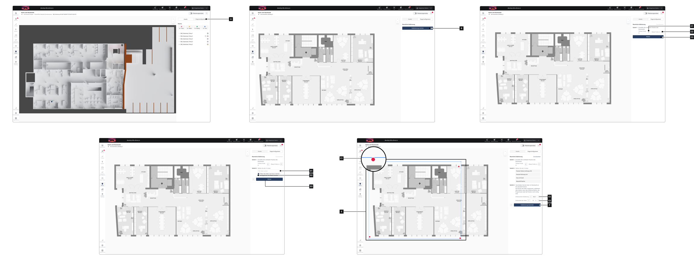 Klicken Sie auf Etage konfigurieren [A] ▷ Die Meldung [G] erscheint in der Seitenleiste. Wenn diese Meldung fehlt, wurde noch keine Anker-Kalibrierung durchgeführt.