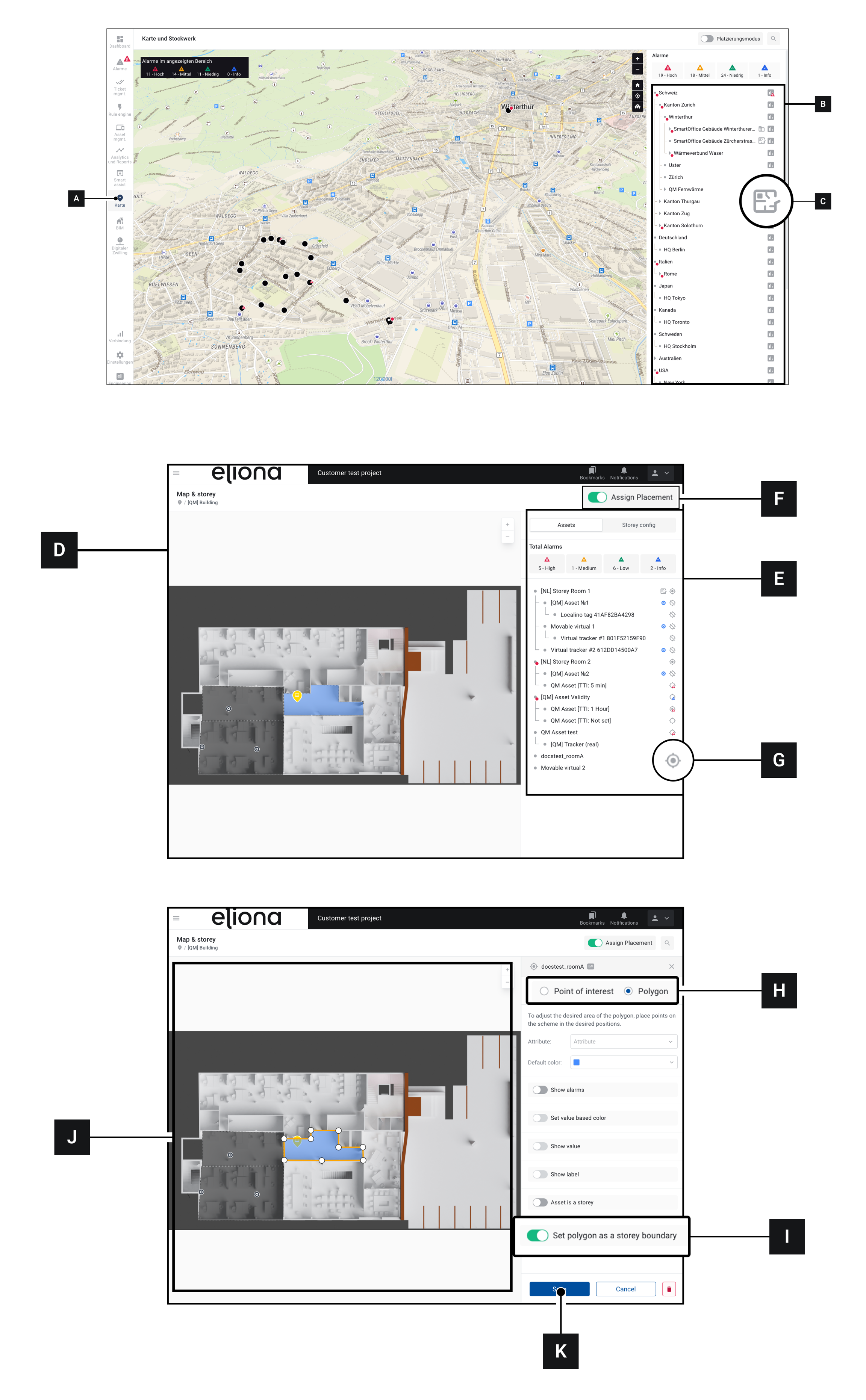 Bei dem Stockwerk, dem Sie den Raum zuordnen wollen: Klicken Sie auf [C] ⌧ HINWEIS: Klicken Sie nicht auf den Namen des Stockwerks! Sie müssen auf das Symbol klicken. ▷ Die Stockwerk-Details [D] öffnen sich. ▷ In der Seitenleiste [E] sehen Sie das Asset, das Sie in den vorherigen Schritten erstellt und dem Stockwerk zugeordnet haben. Gegebenenfalls sehen Sie noch weitere Assets, die dem Stockwerk sind.