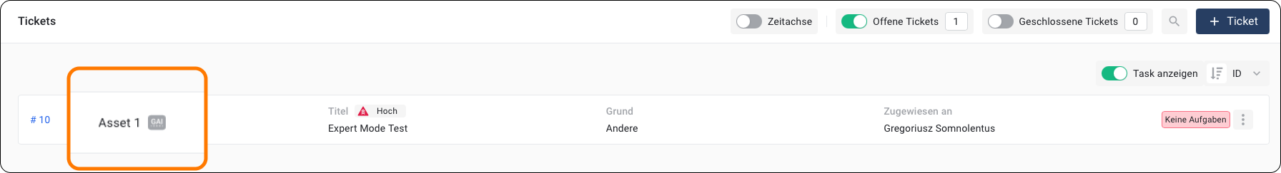 ▷ Der Nutzer sieht Tickets, die sich auf dieses Asset beziehen