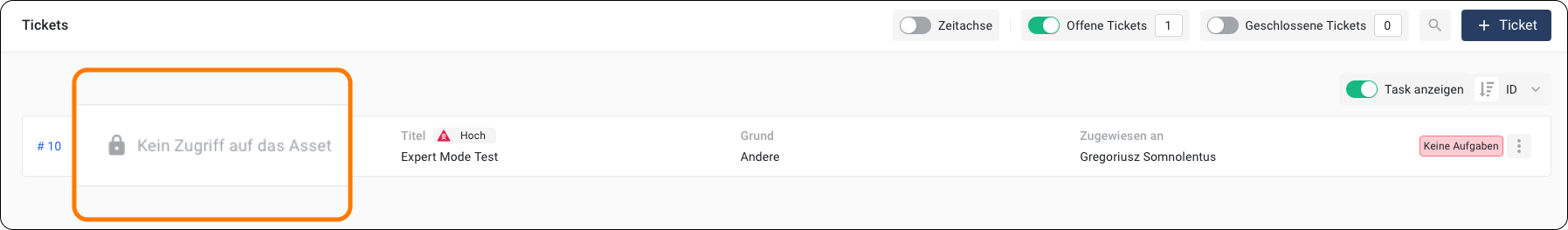 ▷ Der Nutzer sieht keine Tickets, die sich auf dieses Asset beziehen