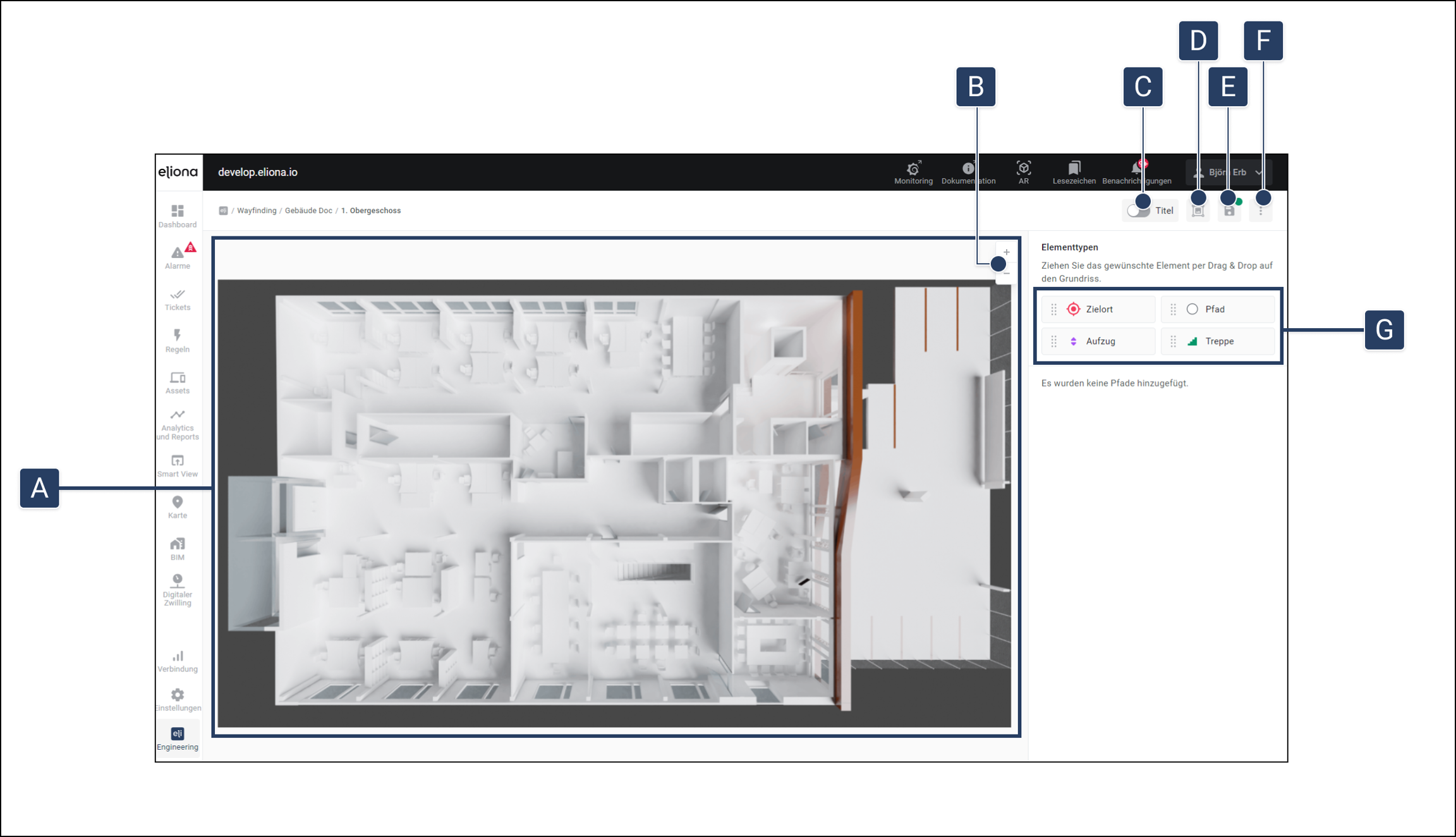 per Drag-and-Drop aus [G] heraus und platziere es auf dem Stockwerk [A] an der gewünschten Stelle. ▷ Es öffnet sich das Fenster "Pfad hinzufügen"