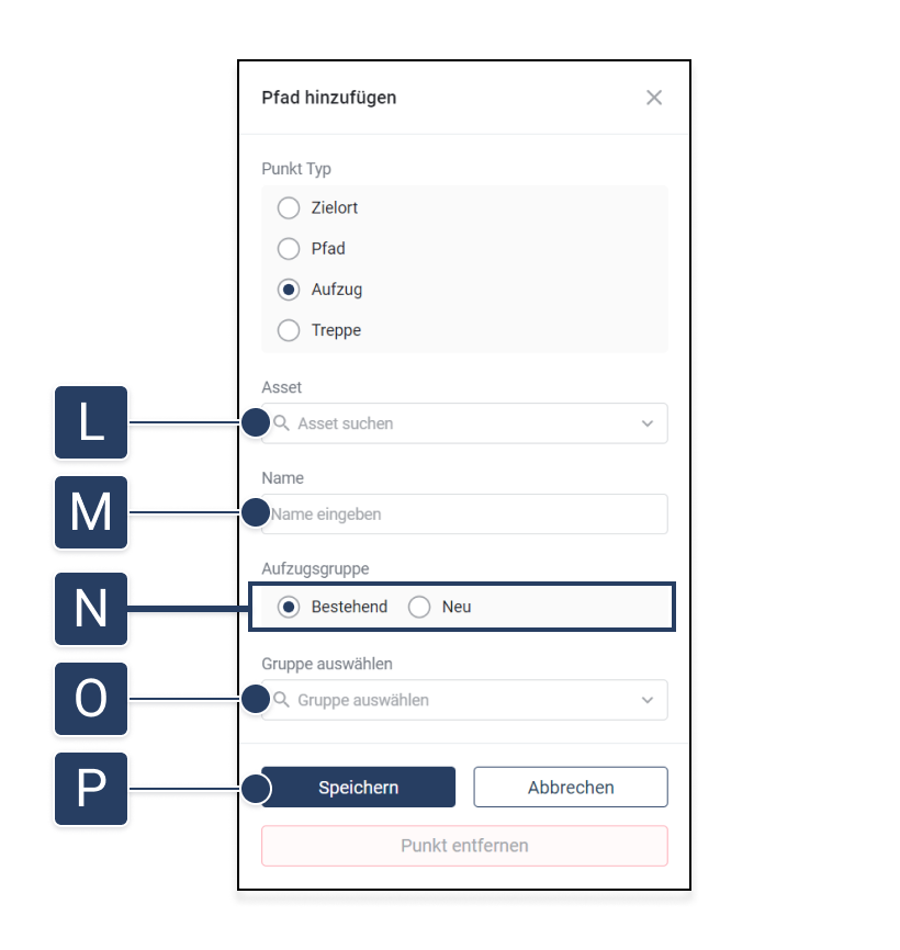 In [L] wählen Sie das Asset aus, das diesen Aufzug oder diese Treppe repräsentiert.