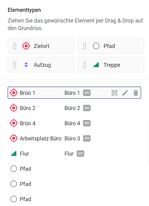 Im Wayfinding-System können Sie gesetzte Elemente sowohl direkt auf dem Stockwerksplan als auch in der Elementeliste auf der rechten Seite unter den Elementtypen [G] bearbeiten. Hier ist, wie Sie Elemente bearbeiten oder löschen können: