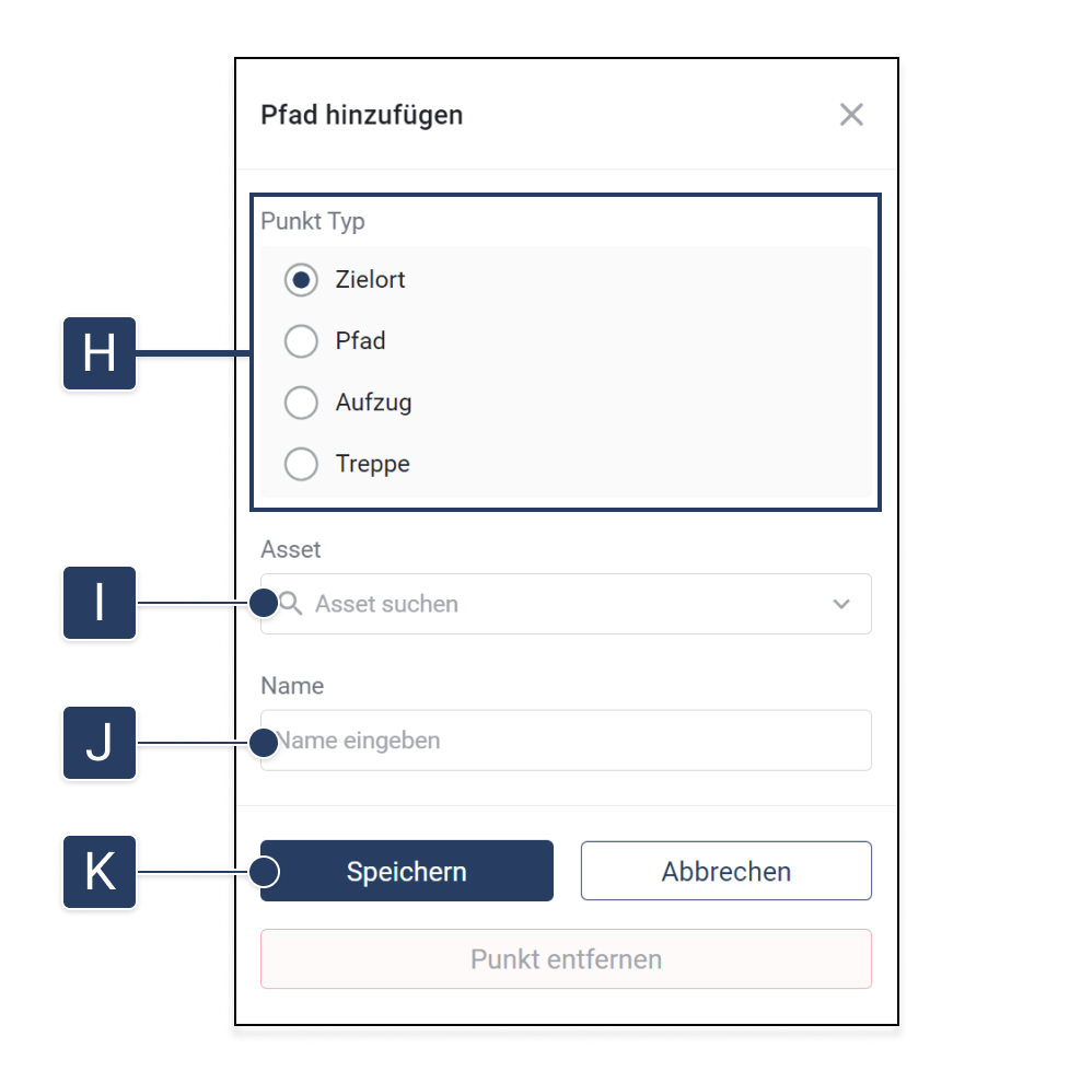 aus [G] per Drag-and-Drop auf das Stockwerk.Knotenpunkt platzieren: Platzieren Sie das Pfad-Element an der gewünschten Stelle auf dem Stockwerk. Dieser Knotenpunkt fungiert als Zwischenpunkt und verbindet verschiedene Zielorte miteinander.