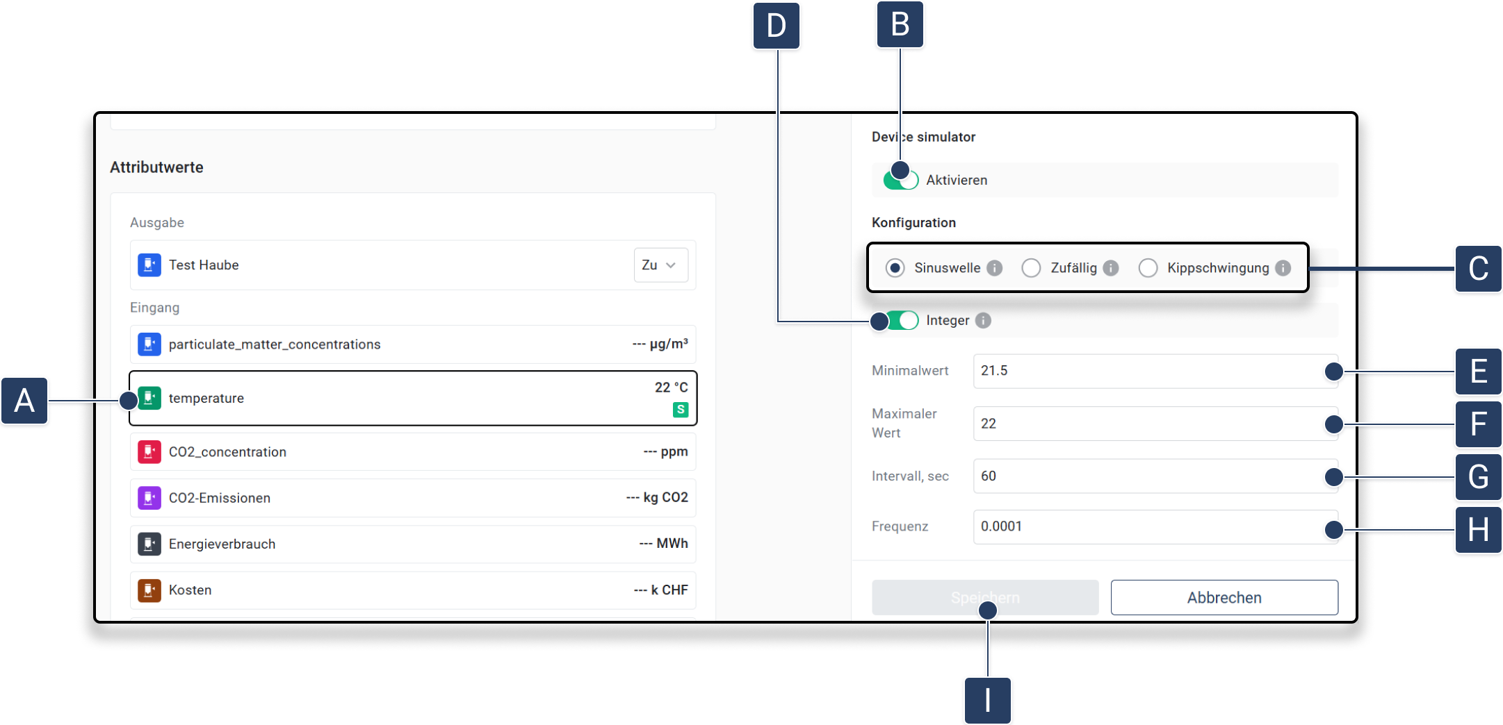 Einstellungen speichern: Klicken Sie auf Speichern, um die Konfiguration zu übernehmen [I]. ▷ Die Simulation wird mit den gewählten Parametern aktiviert.