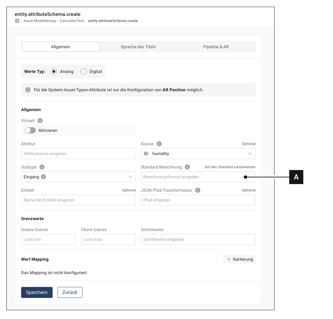 Sie können in Feld [A] Berechnungen ausführen. Diese Berechnungen gelten dann für alle Assets dieses Typen, können jedoch dann auch im einzelnen Asset überschrieben werden.