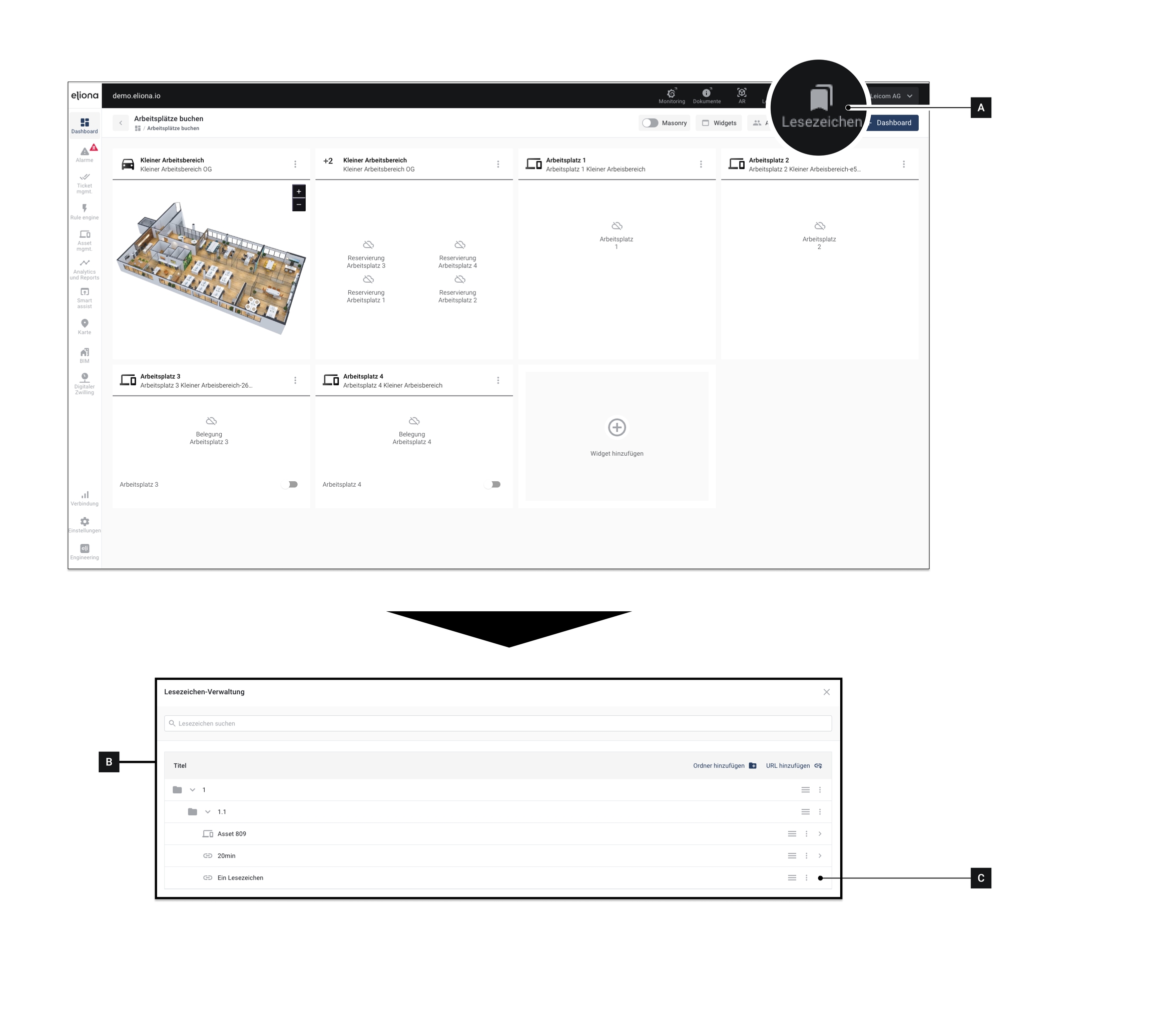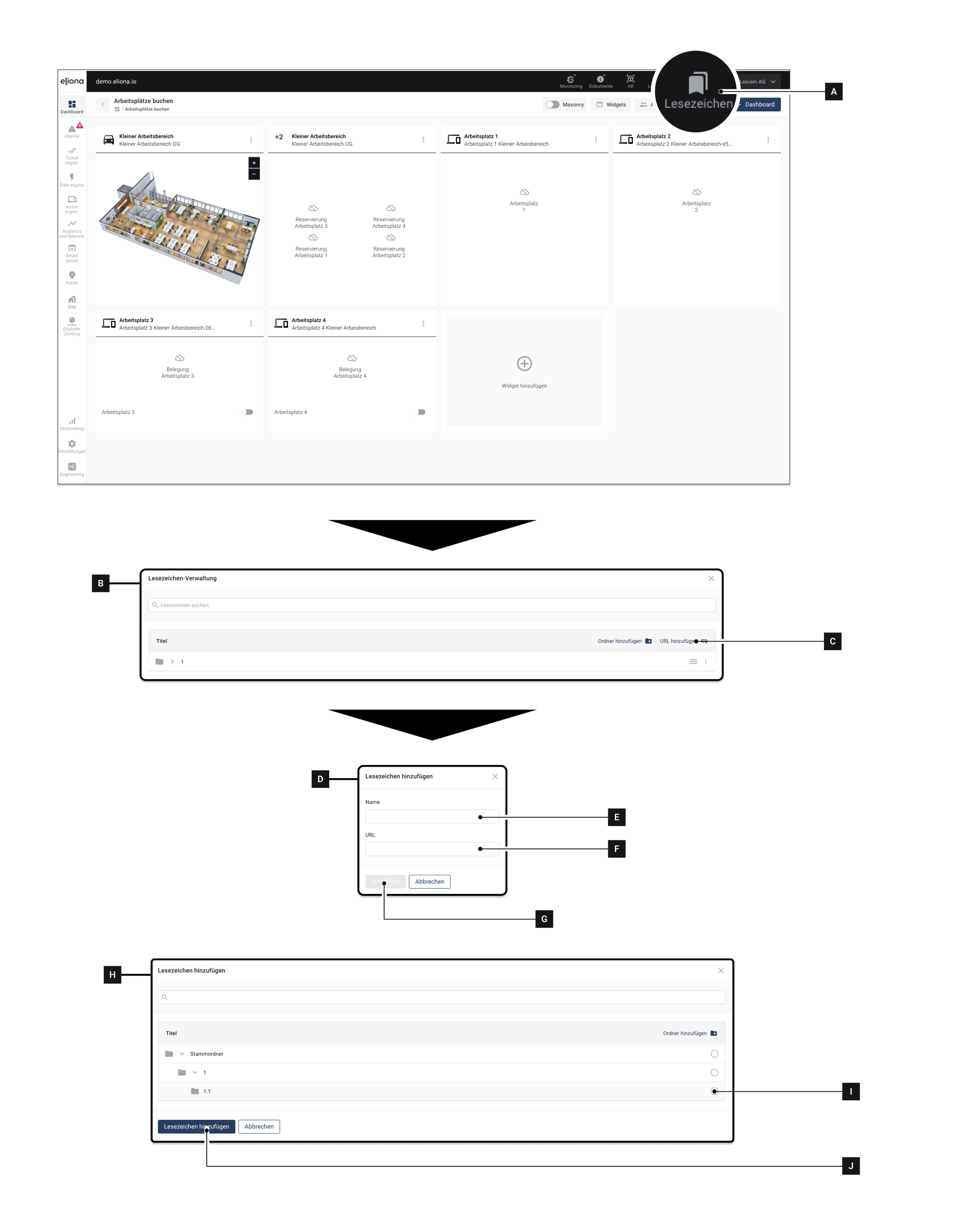 Mit der Funktion "Lesezeichen" können Sie Links zu externen Ressourcen, aber auch zu Elementen innerhalb von Eliona verlinken.