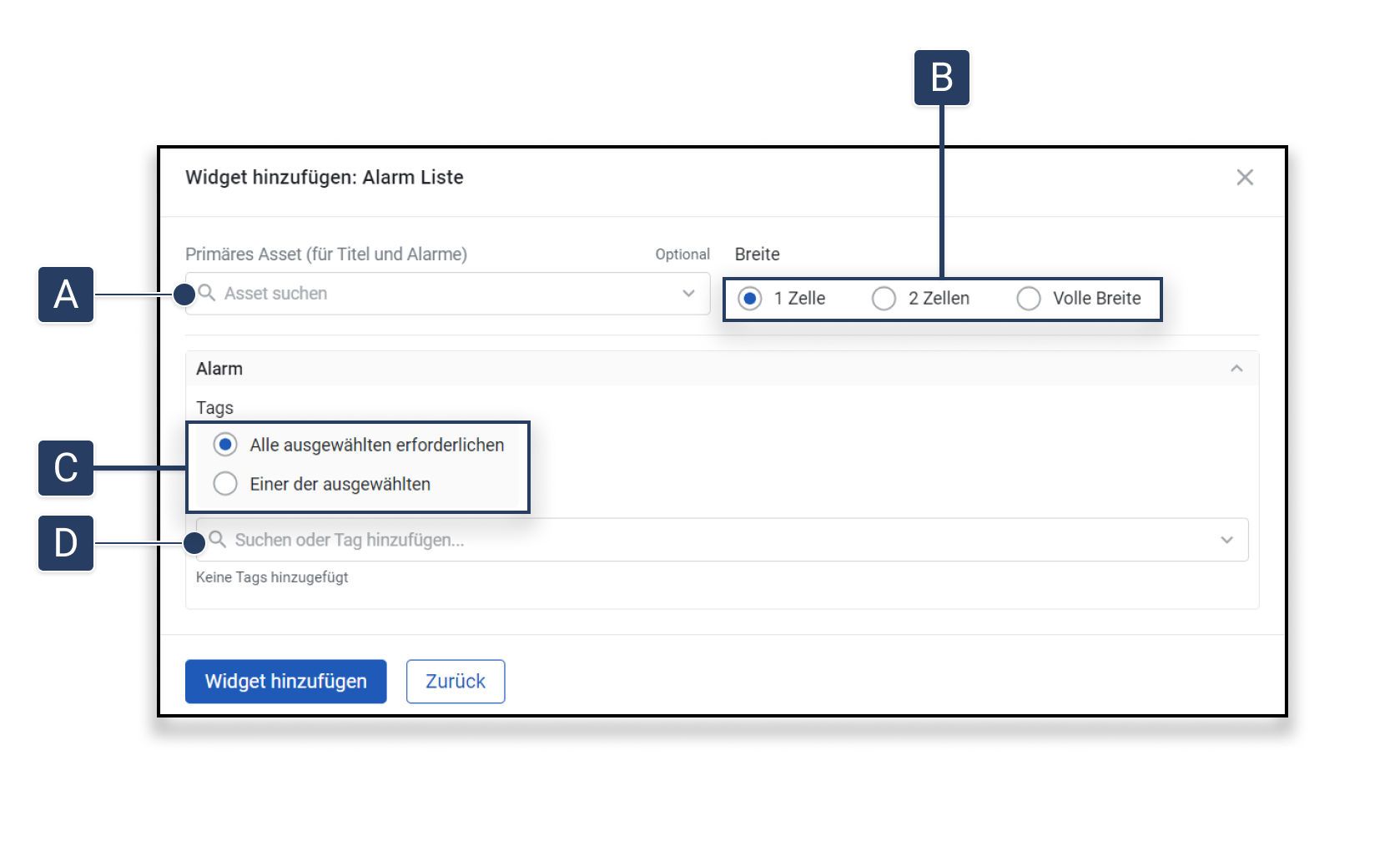 Wählen Sie die Tags aus, nach denen die Alarme im Widget gefiltert werden sollen, um nur die relevanten Alarme anzuzeigen.