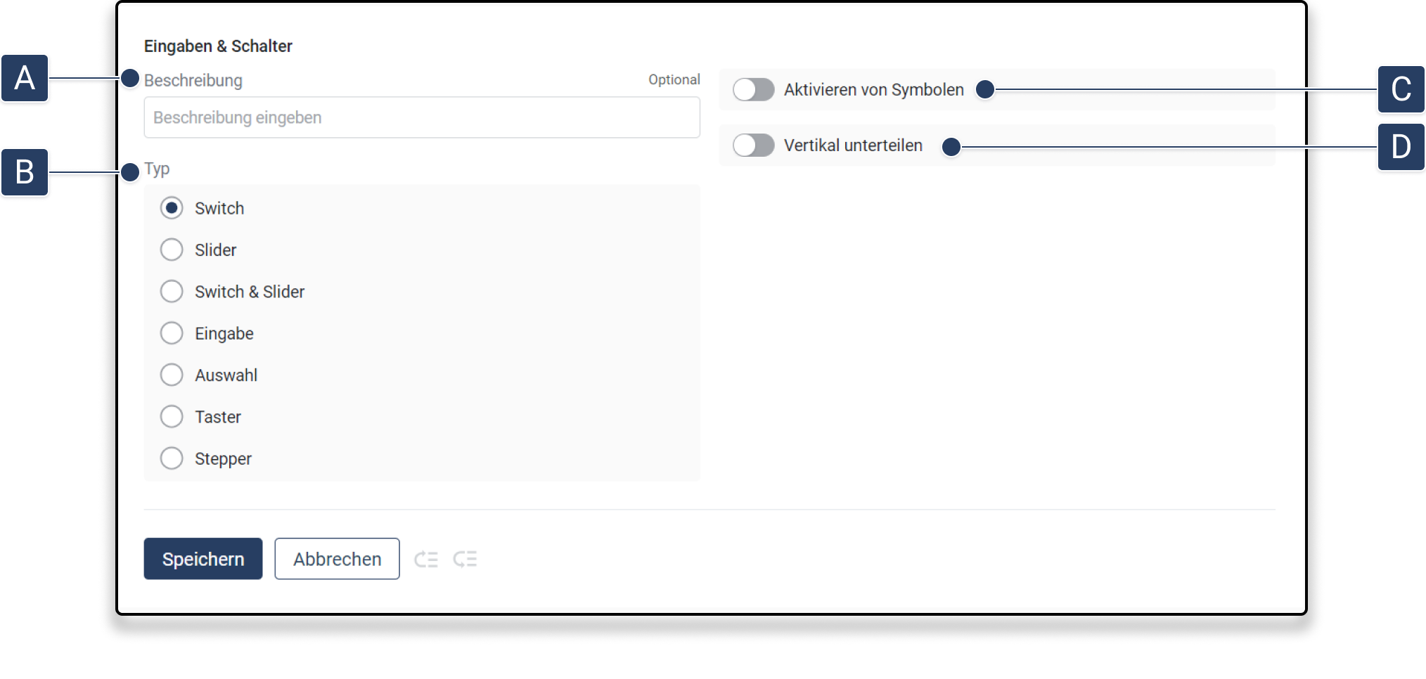 Mit dem Modul "Eingaben & Schalter" können Sie verschiedenste Schalter, Slider sowie Felder zur Eingabe von Werten in einem Widget darstellen.