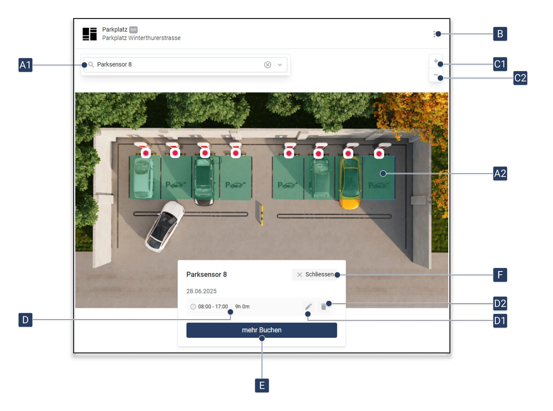 Klicken Sie auf [A], um die detaillierte Buchungsliste anzuzeigen. ▷ Die Buchungsliste [1] wird ausgeklappt und zeigt alle aktuellen Buchungen mit Zeitangaben.
