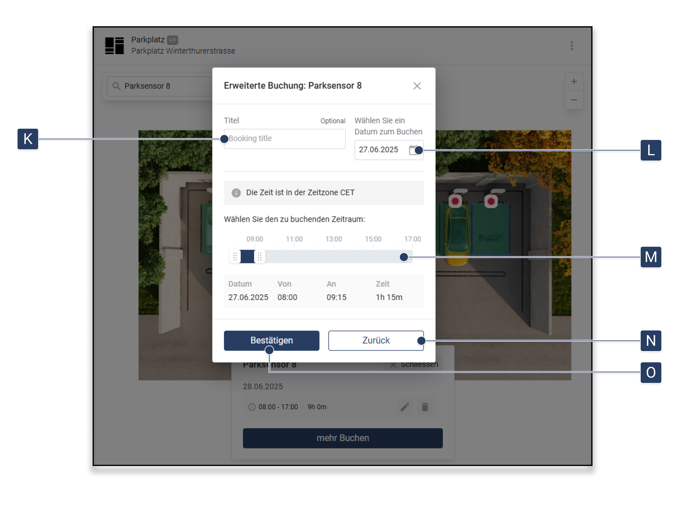 Nachdem Sie ein Asset ausgewählt haben, stehen Ihnen mehrere Optionen zur Verfügung, um Ihre Buchung weiter anzupassen.