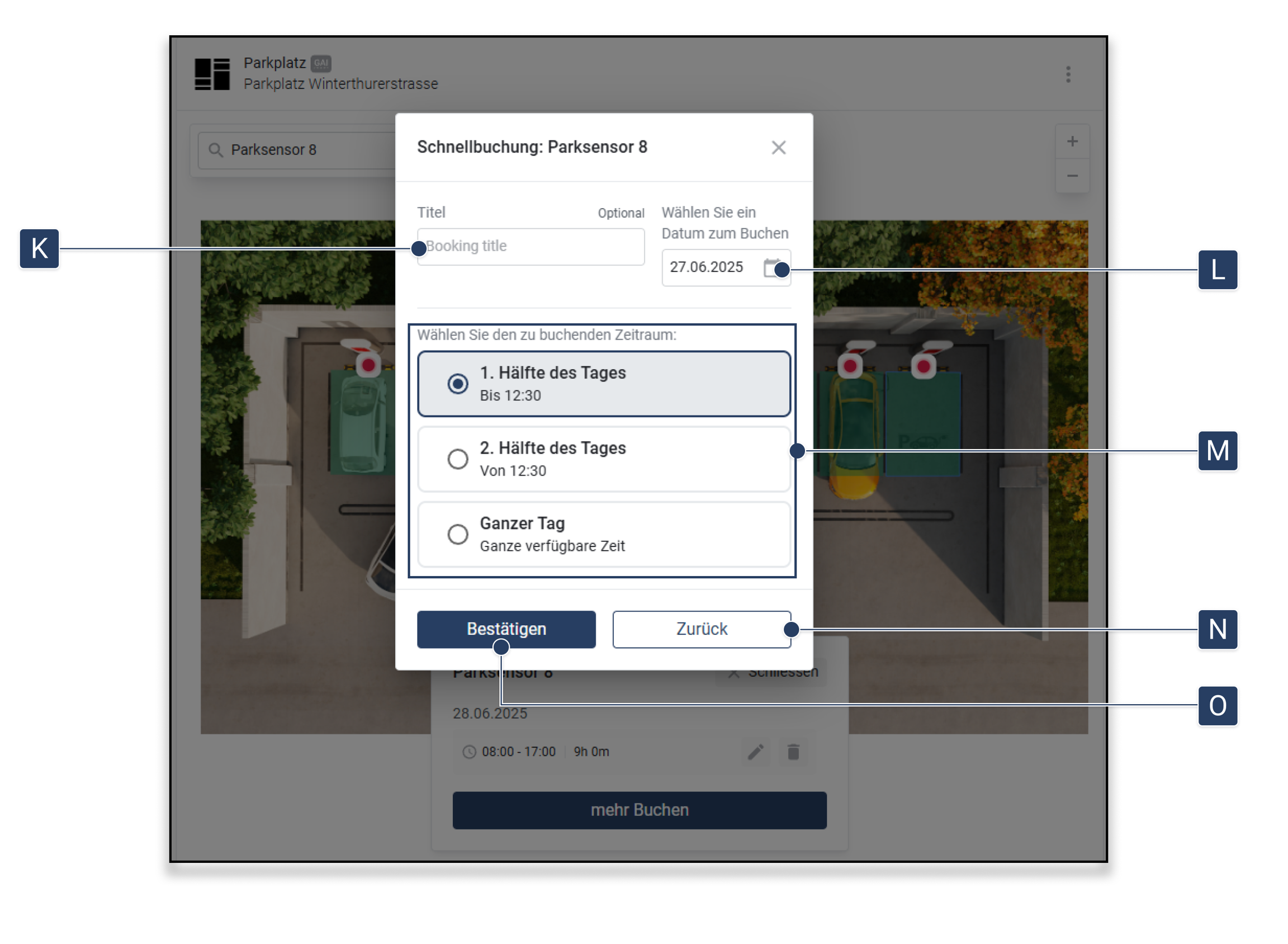 Wählen Sie aus, ob Sie die erste Hälfte des Tages, die zweite Hälfte oder den ganzen Tag buchen möchten. Die genauen Zeiträume können in der Booking App konfiguriert werden.