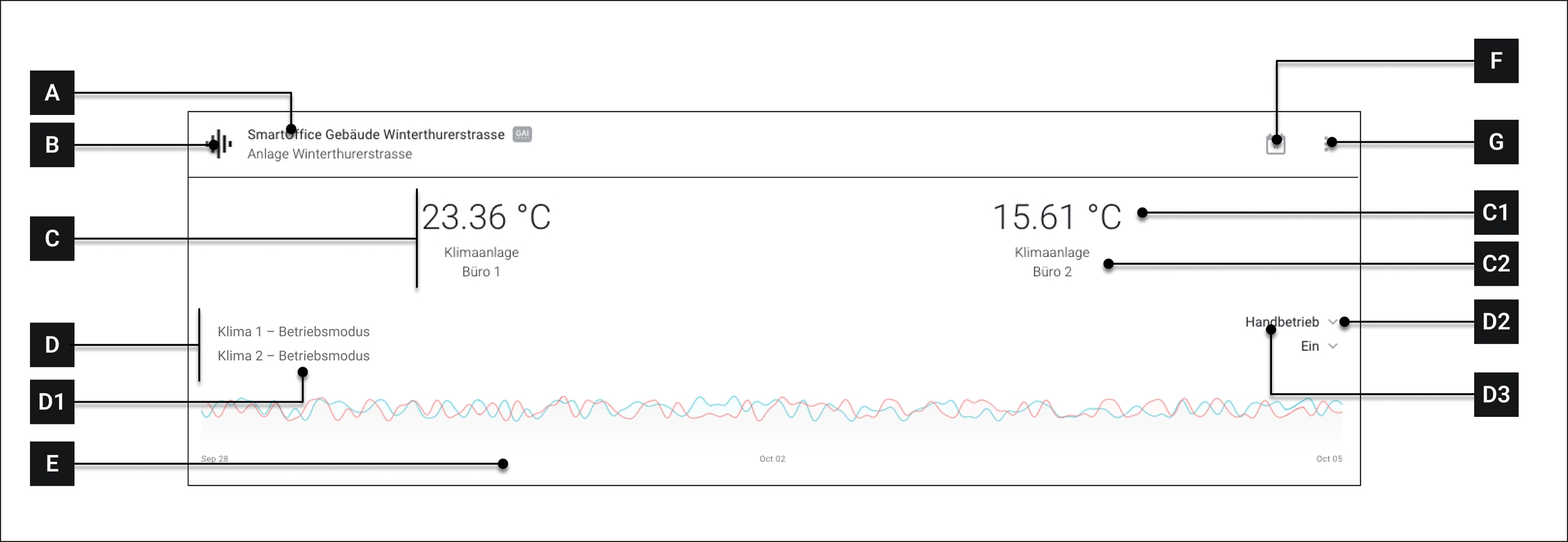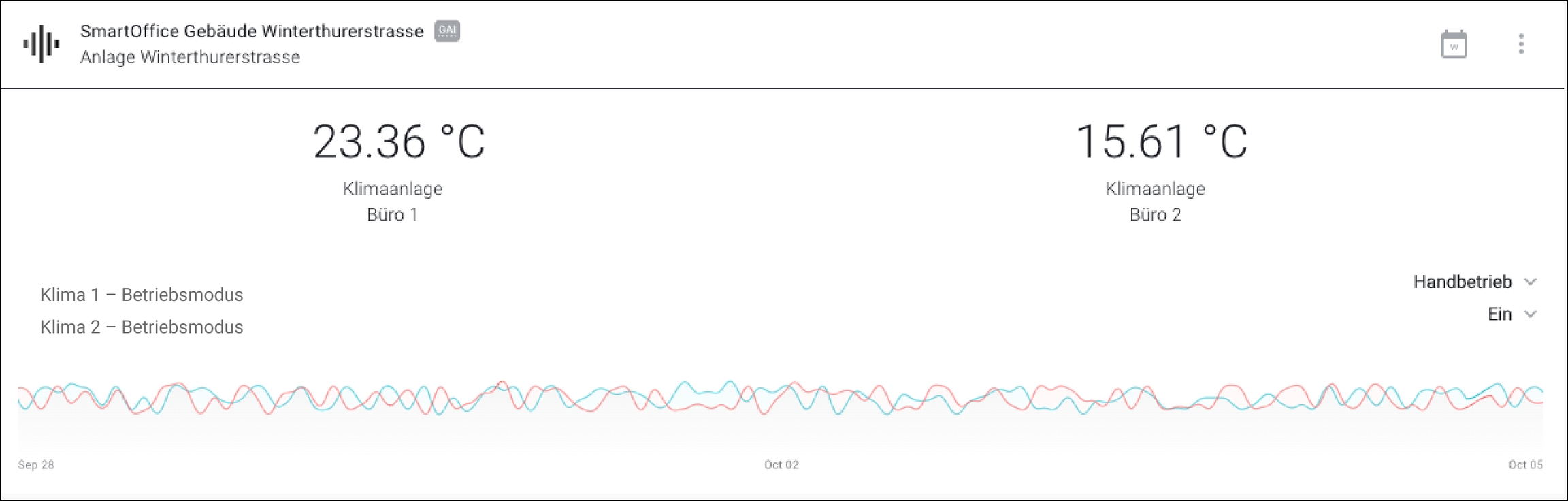 Im Beispiel bezieht sich die Auswahl auf "Klima 1 - Betriebsmodus" und befindet sich im Zustand "Handbetrieb".