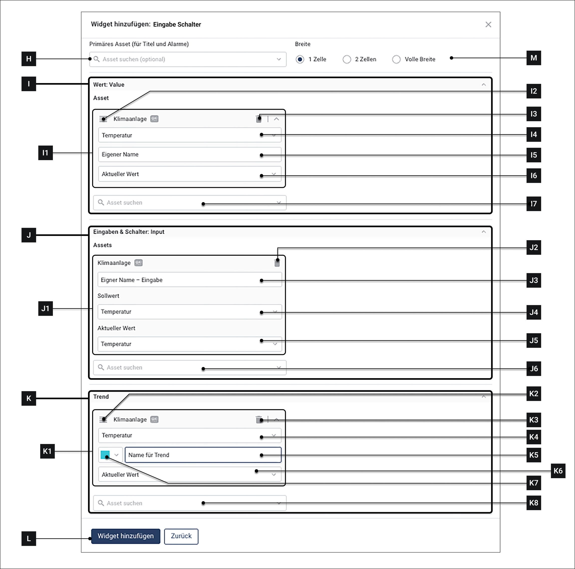 Hier können Sie ein oder mehrere Assets verknüpfen, die im Abschnitt “Schalter“ [D] angezeigt werden. Diese Assets werden Sie direkt über das Widget konfigurieren können.