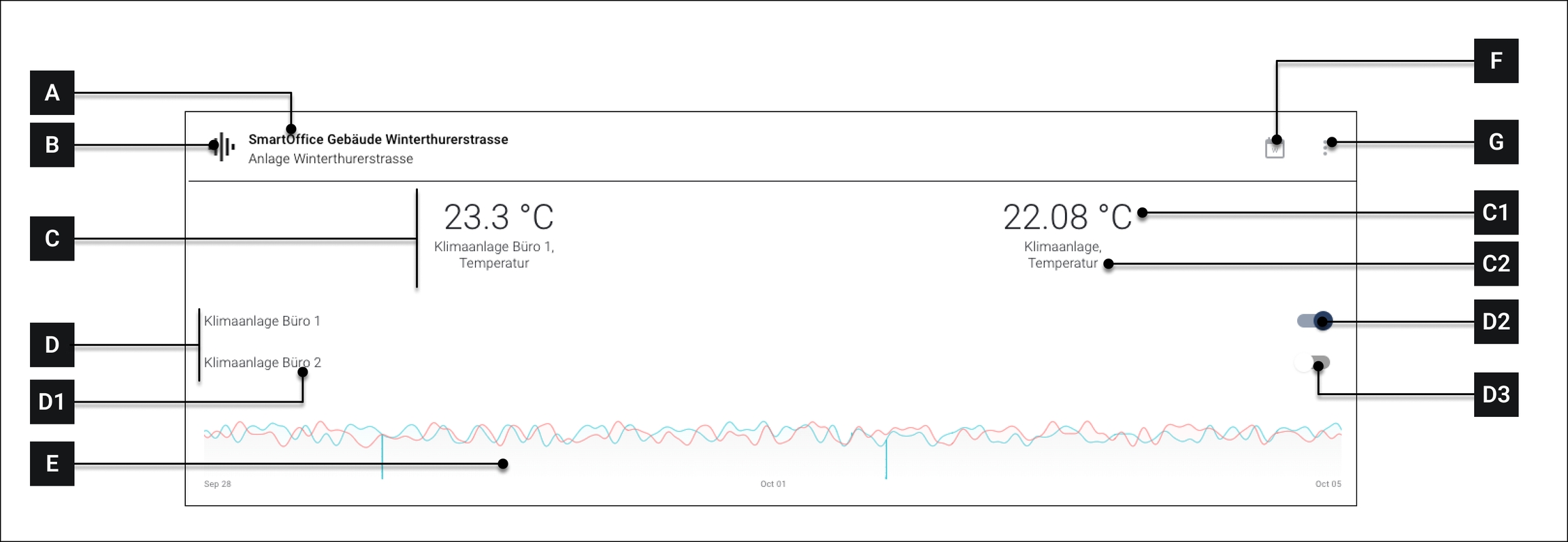 Ein verknüpftes Asset. Die Daten dieses Assets werden im Abschnitt "Schalter" [D] angezeigt und können dort auch gesteuert werden