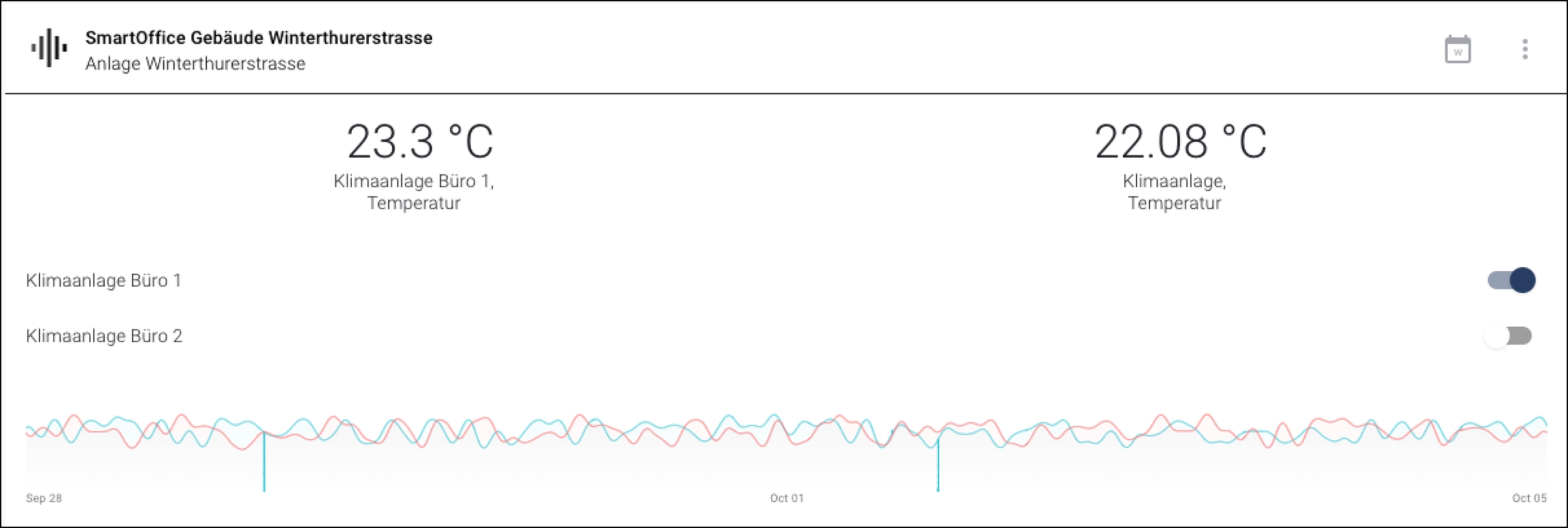 Beispiel: Sie verknüpfen mehrere Klimaanlagen-Assets mit dem Widget. Sie sehen für jede einzelne Klimaanlage:
