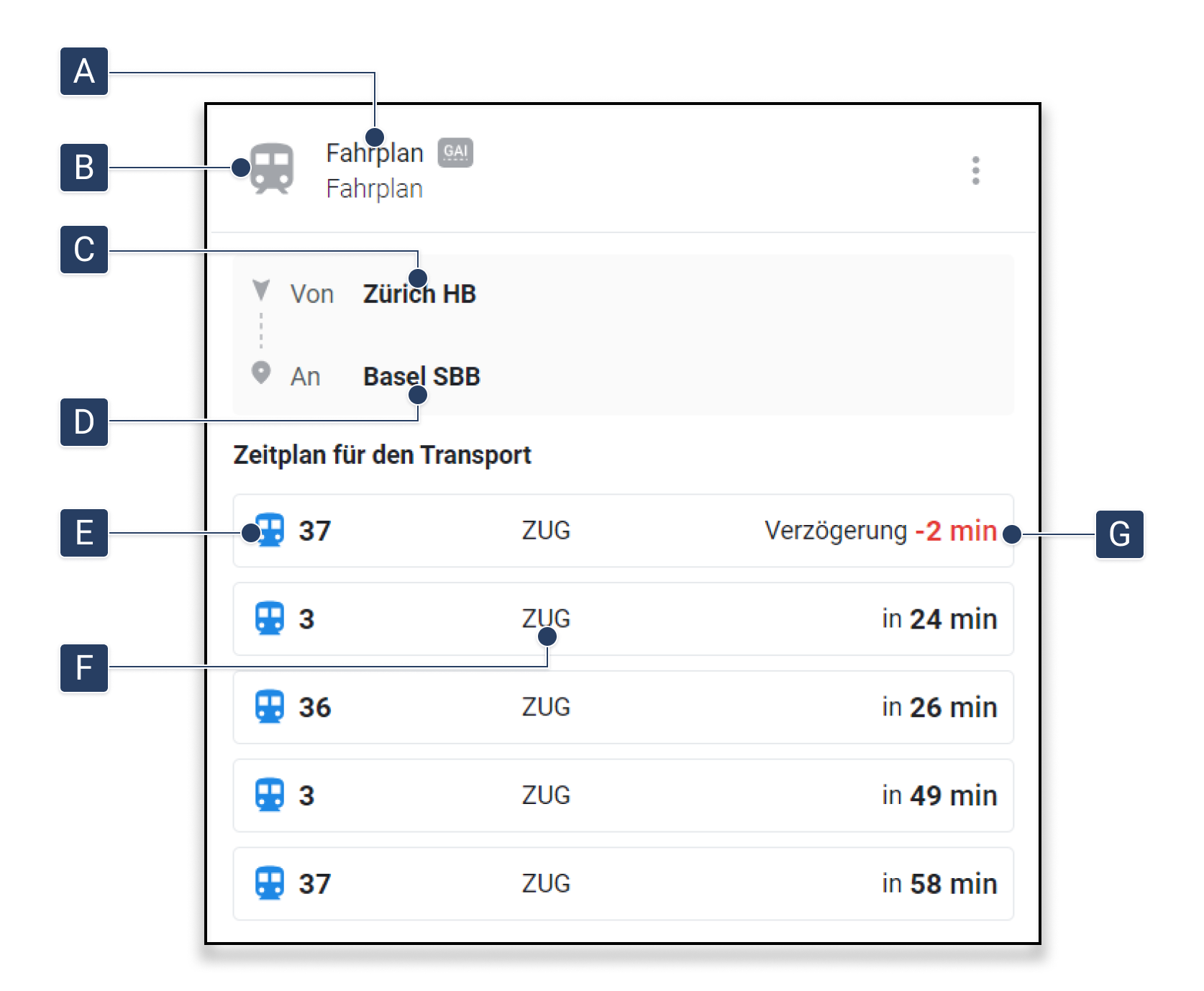 Das Widget "Fahrplan" zeigt Abfahrtszeiten von einem Startpunkt und optional zu einem Zielort an. Es werden ausschließlich Daten der SBB (Schweizerischen Bundesbahnen) angezeigt.