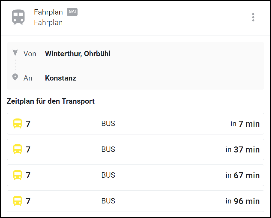 Fügen Sie das Fahrplan Widget als ↗ Benutzerdefiniertes Widget hinzu.