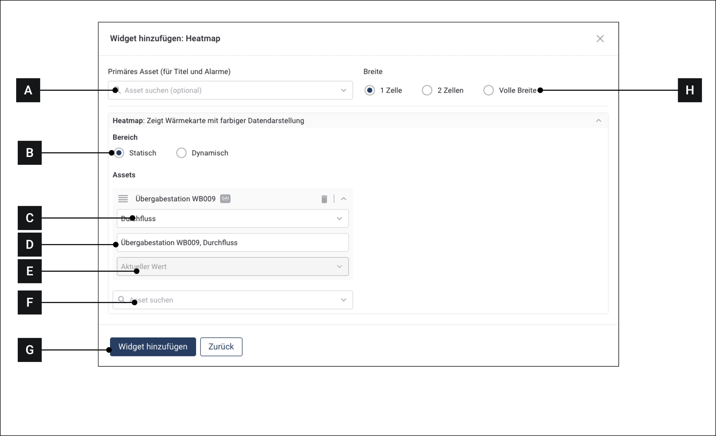Wählen Sie das Primäre Asset. Der Name dieses Assets wird in der Titelzeile des Widgets erscheinen [A].
