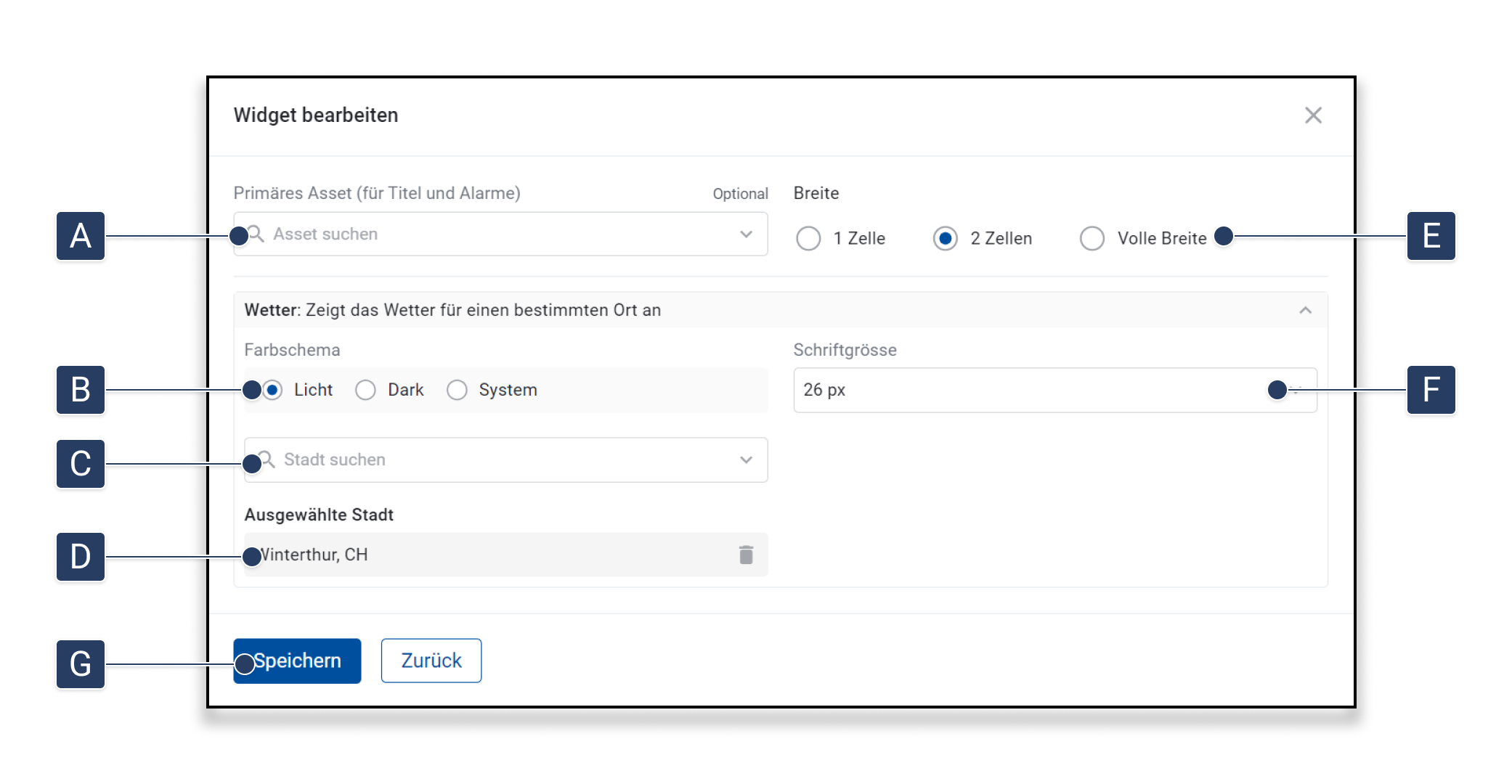 Wählen Sie das Primäre Asset. Der Name dieses Assets wird in der Titelzeile des Widgets erscheinen [A]