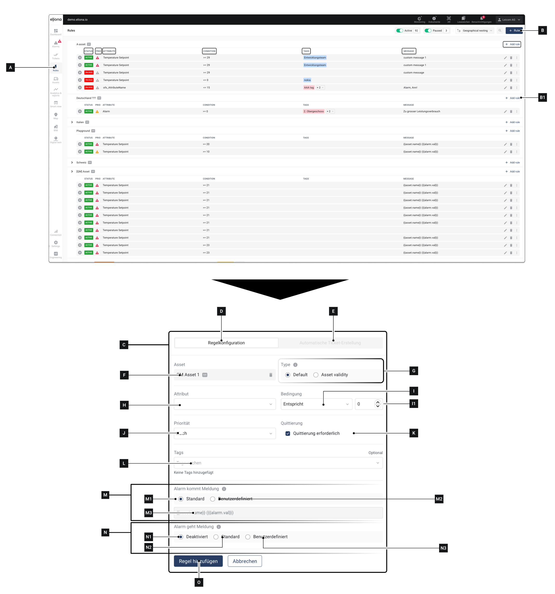 Die vollständige Dokumentation finden Sie im Kapitel ↗ Alarme, Regeln, Eskalationen