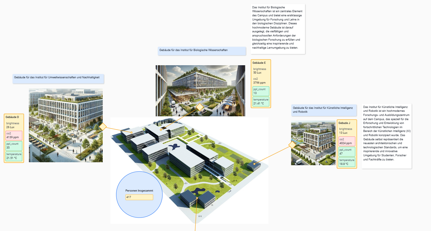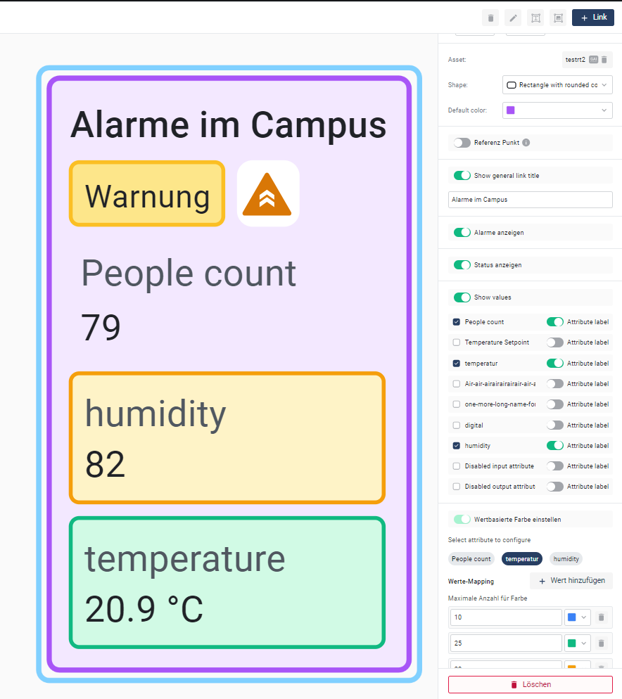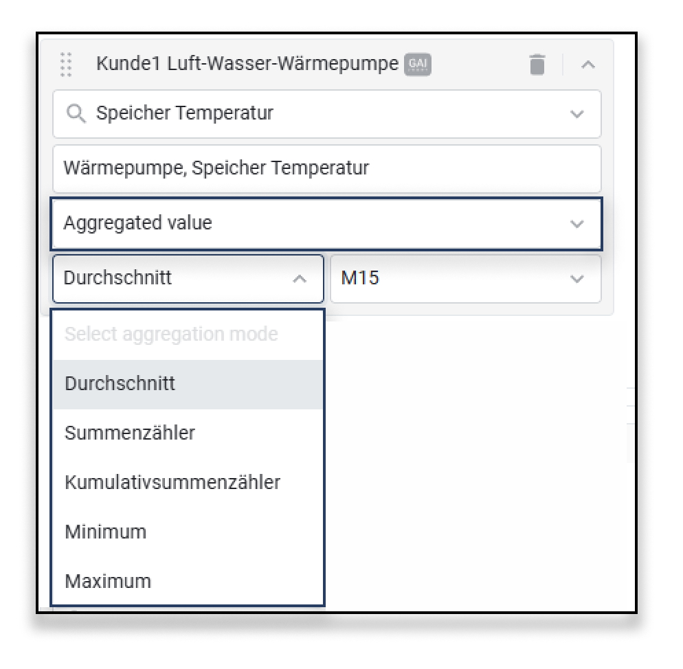 Im Digital Twin sowie im Stockwerk können nun aggregierte Werte genutzt werden. Diese Erweiterung erlaubt die Visualisierung von historischen und zusammengefassten Daten direkt im Gebäudekontext. Aggregationen wie Durchschnitt, Minimum oder Maximum stehen dabei zur Verfügung – ideal für die Analyse von Zuständen über Zeiträume hinweg.