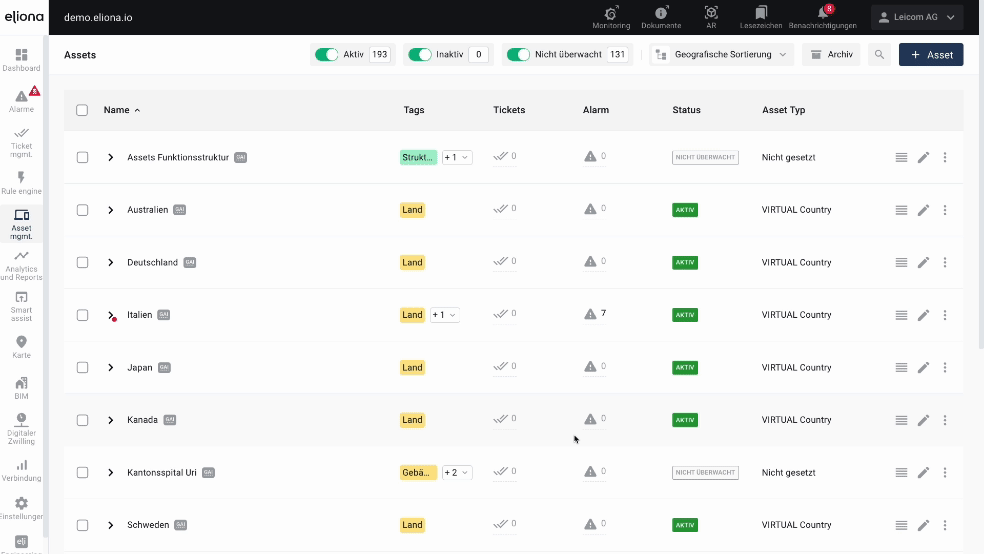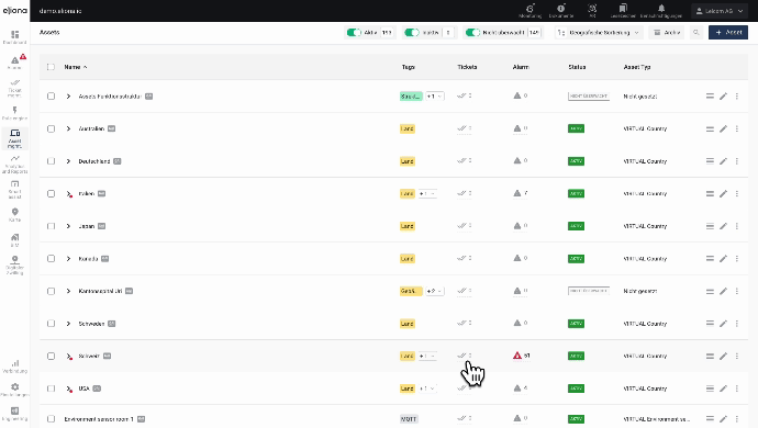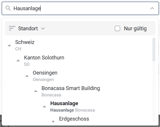Die Assets werden in einer geografischen Struktur dargestellt, die sich per Klick auf das Dreieckssymbol aufklappen lässt. Mit der Option Nur gültig können ausschließlich jene Assets angezeigt werden, die für die Auswahl relevant sind. Nicht auswählbare Assets sind ausgegraut und somit klar erkennbar.